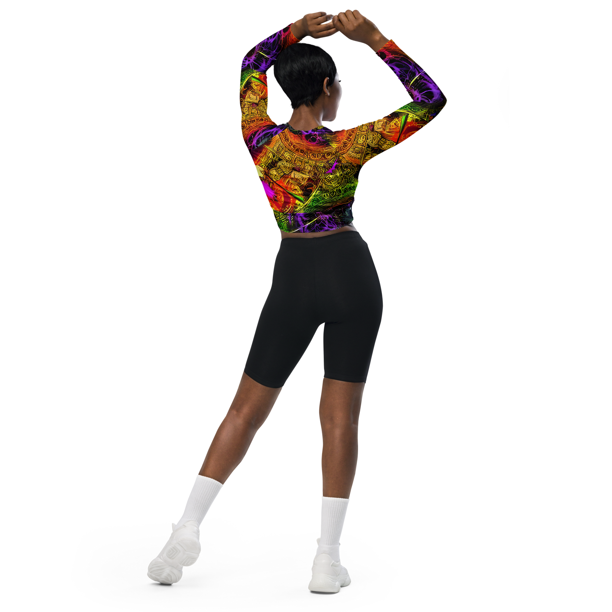 Step into the future of fashion with our long-sleeve crop top, adorned with a vibrant pattern that bursts with neon purples, electric yellows, and hot pinks. Intricate, glyph-like linework adds a sense of cosmic wonder and technological mystique, making it a standout piece for any avant-garde event or creative gathering. Crafted from recycled materials, this eco-chic top offers UPF 50+ protection and a flattering cropped silhouette, ensuring you stay stylish and sustainable all year round.