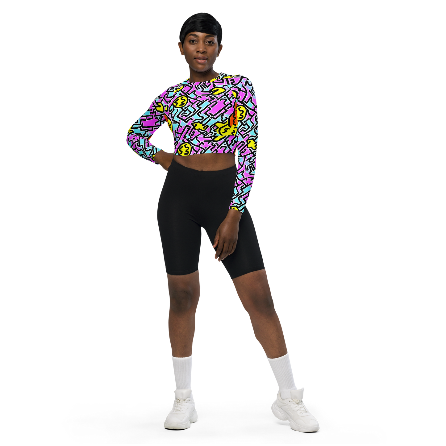 Unleash your inner rebel with our electrifying long-sleeve crop top, enveloped in a dynamic display of neon pink, electric yellow, and bold black scribbles set against a striking cyan backdrop. The energetic zigzags and abstract shapes channel the essence of street art, making this top a perfect choice for those looking to stand out at music festivals or inject a dose of originality into their everyday look. Crafted for the bold and the spirited, this crop top is a must-have addition to your spring or summer collection.