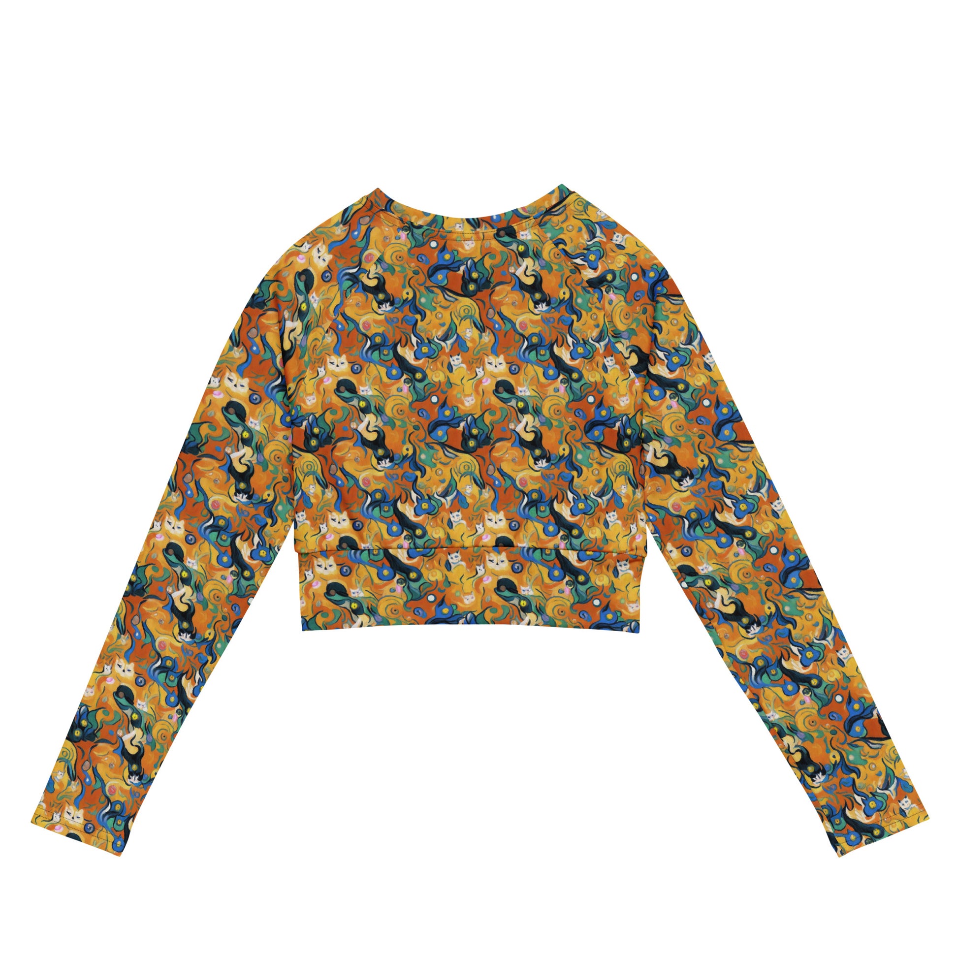 Step into a world of whimsy and creativity with our "Whimsical Feline Dance" long-sleeve crop top! Adorned with a mesmerizing pattern of swirling blues, greens, and fiery oranges, this top captures the playful essence of kittens dancing in a Van Gogh-inspired dreamscape. Crafted for the vibrant spirit, it's the perfect statement piece for art shows, eclectic soirées, or casual outings. Embrace eco-chic style while making a bold impression!
