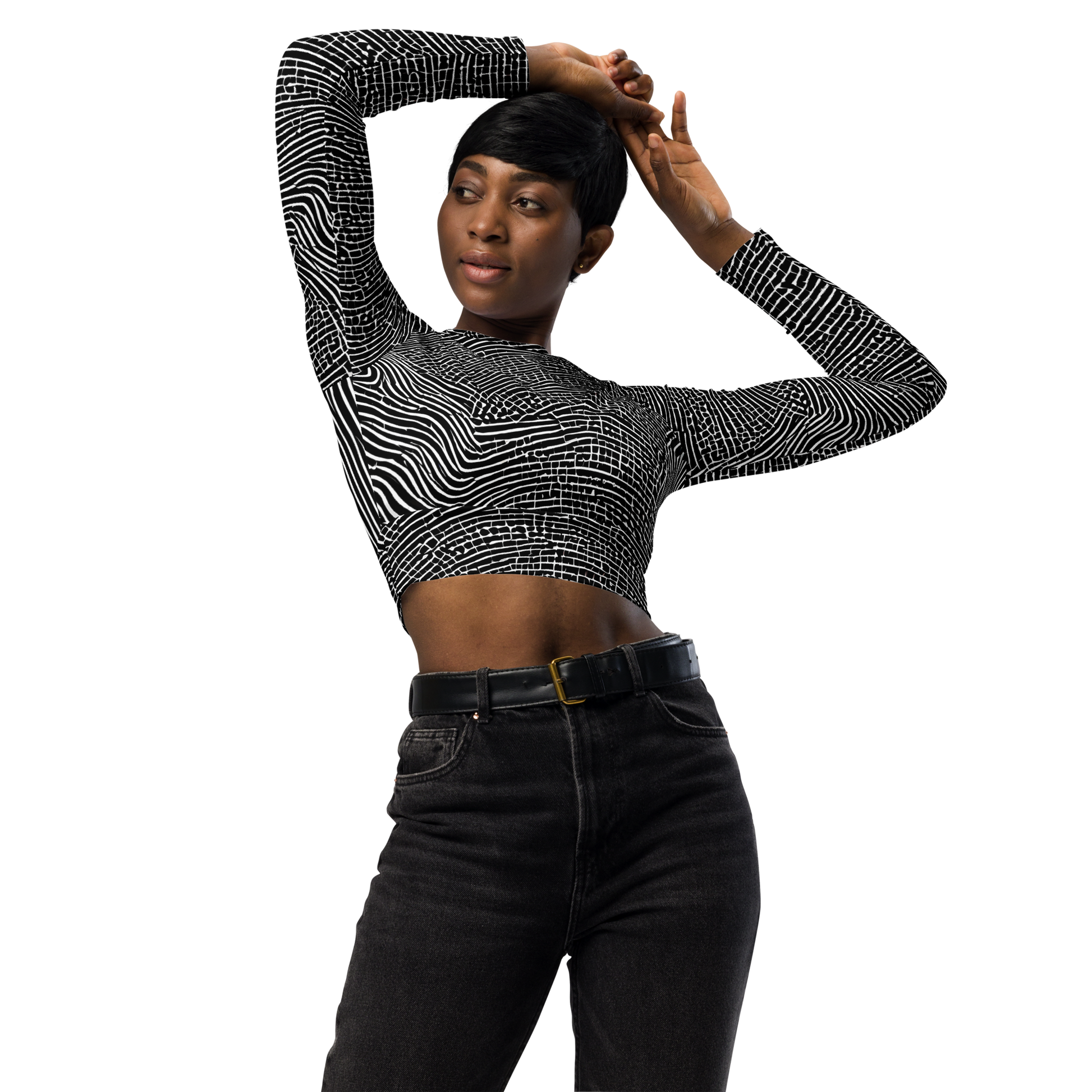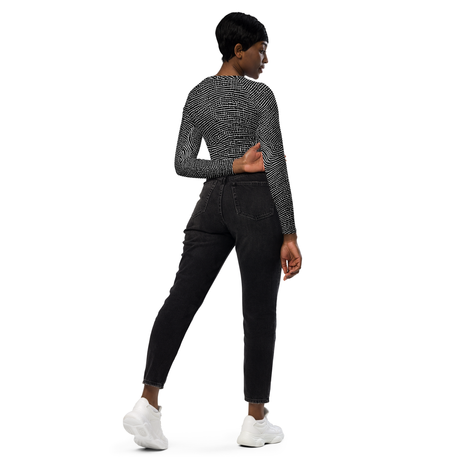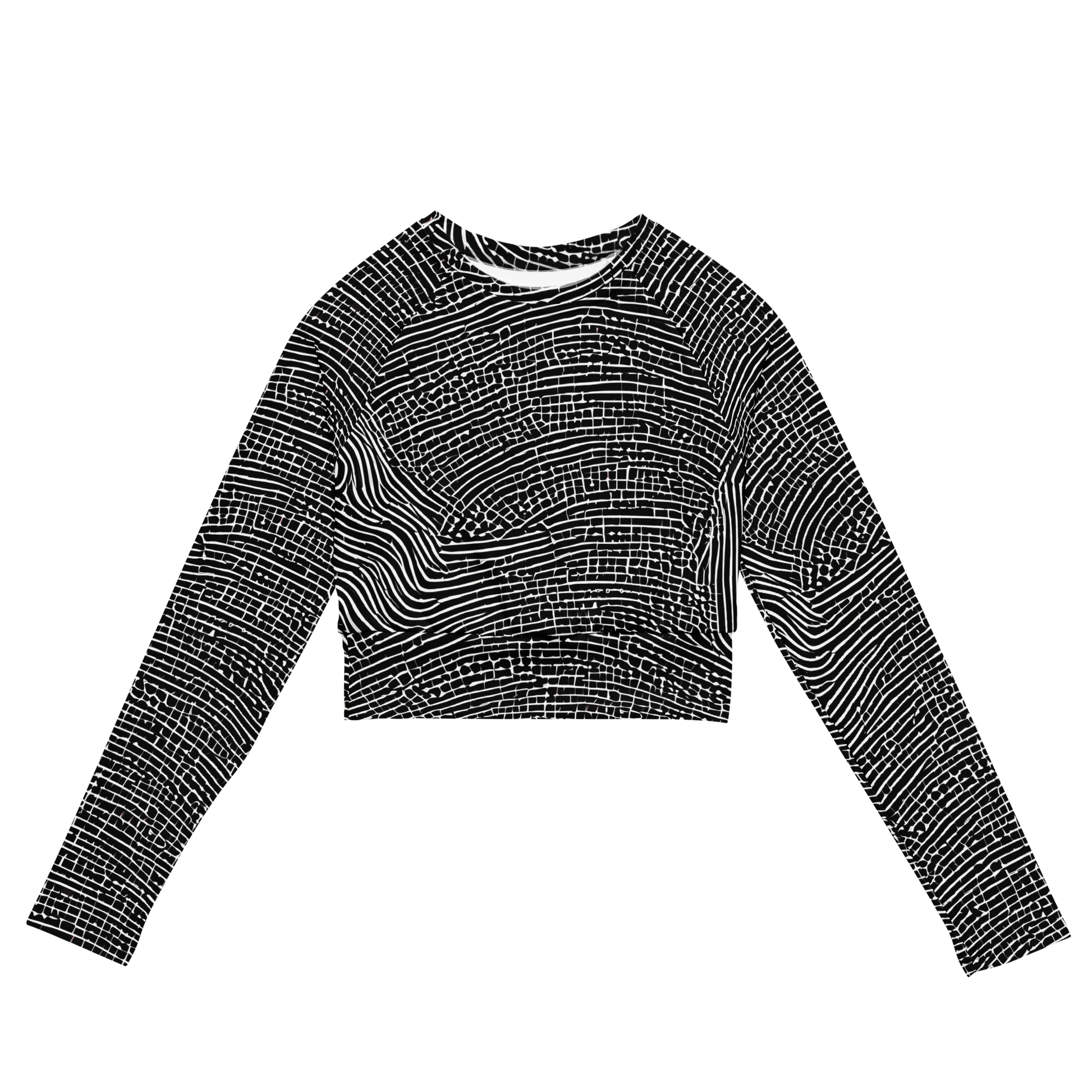 Step into a world of elegance and artistic flair with our "Zenith Stripes" long-sleeve crop top! This stunning piece features a captivating interplay of black and white lines that evoke the dynamic beauty of topographical maps and sound waves. Crafted for the bold and creative individual, it’s the perfect companion for avant-garde gatherings or art gallery events, embodying both sophistication and sustainability. Made from eco-friendly materials, this crop top not only enhances your style but also protects our planet. Don’t miss out on this unique blend of modern elegance and artistic expression!