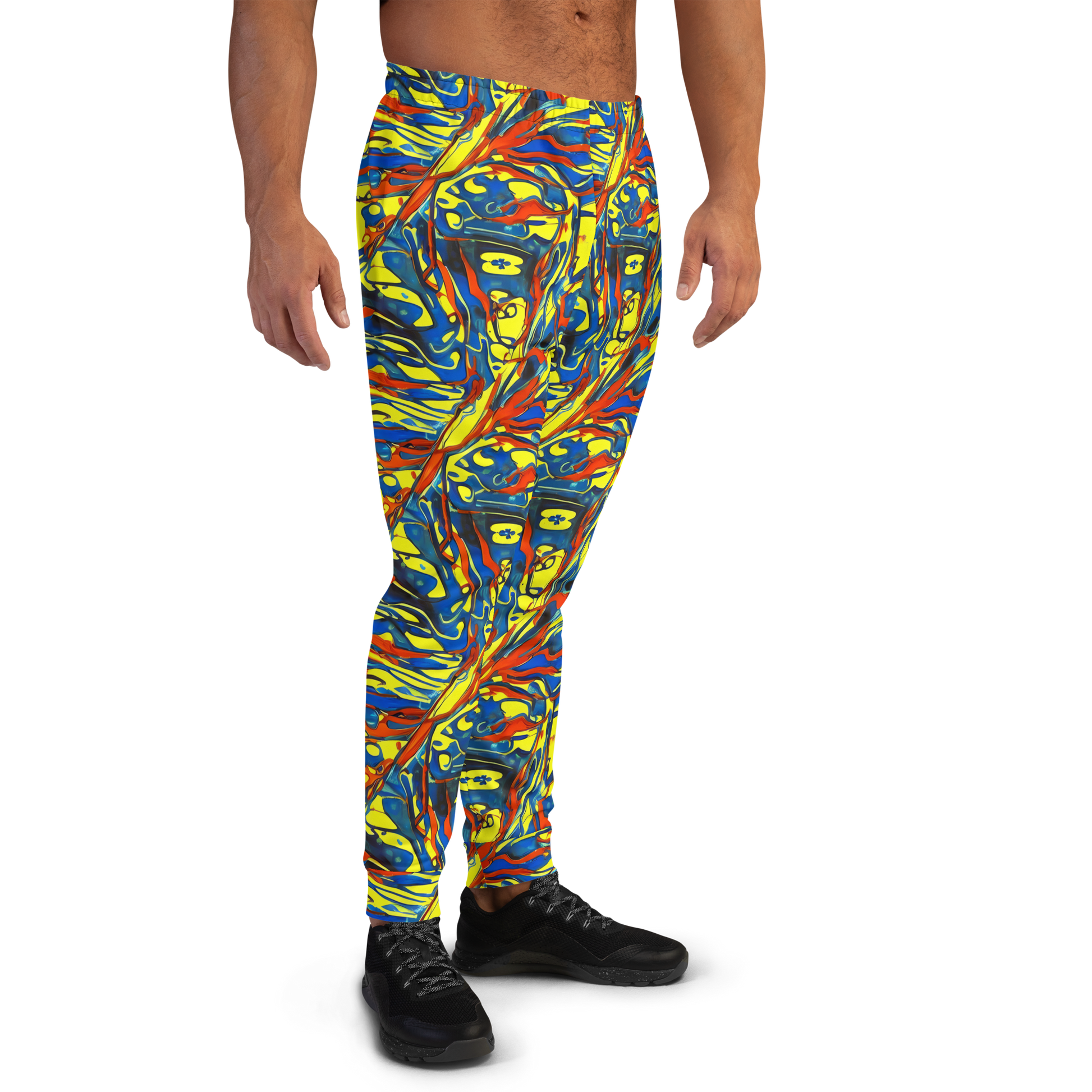 Unleash your boldness with our Men's Joggers featuring the electrifying "Cyberflow Circuit" pattern. This vibrant design, a fusion of electric blues, fiery reds, and luminous yellows, captures the essence of a digital maze, making these joggers a must-have for the tech-savvy and style-conscious alike. Whether you're hitting the streets or lounging at home, these joggers provide unmatched comfort and a striking aesthetic that ensures you stand out in any crowd.
