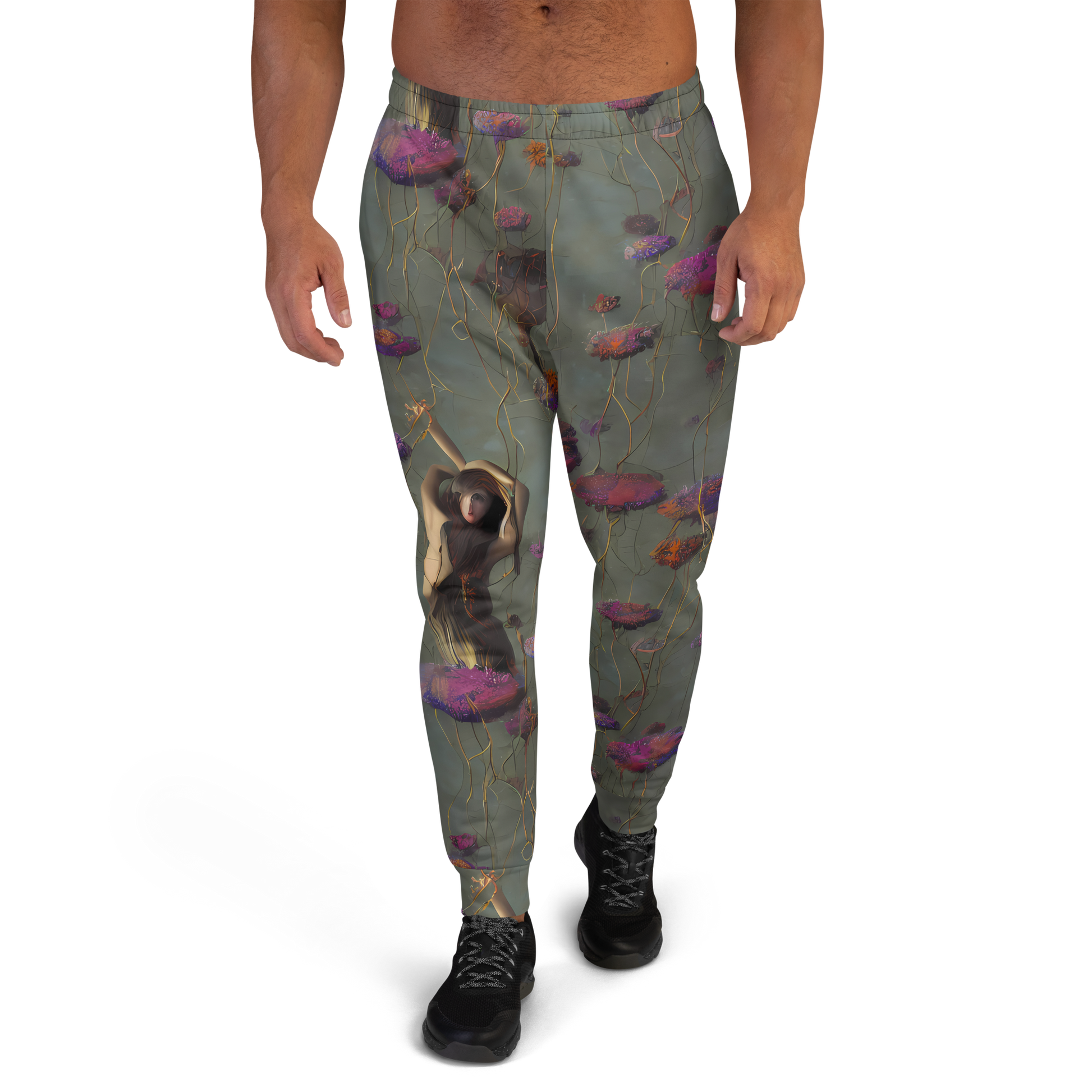 Wrap yourself in the enigmatic charm of twilight gardens with our latest joggers, where art meets the whisper of late-night florals. Draped in a canvas of deep hues, these pants feature a captivating dance of purple, blue, and orange blossoms, accented by shimmering golden lines. The rich, textured design invites a sense of sophisticated nostalgia, perfect for those who seek a wardrobe infused with the romance of surreal landscapes and the graceful contrast of dusk's last light.