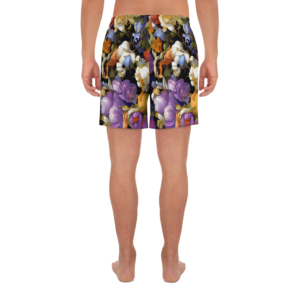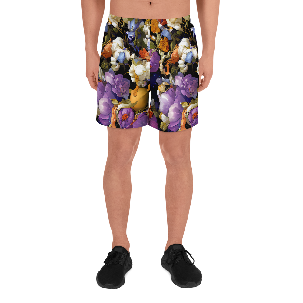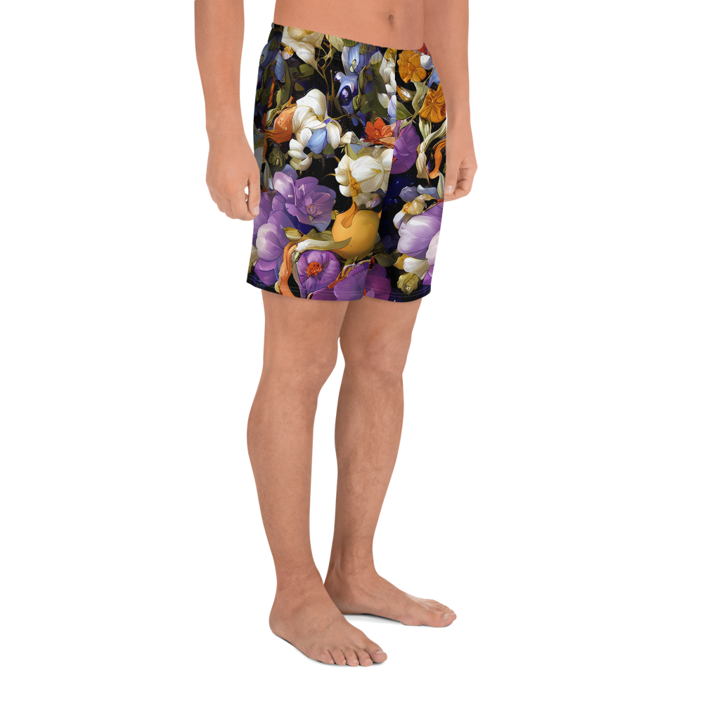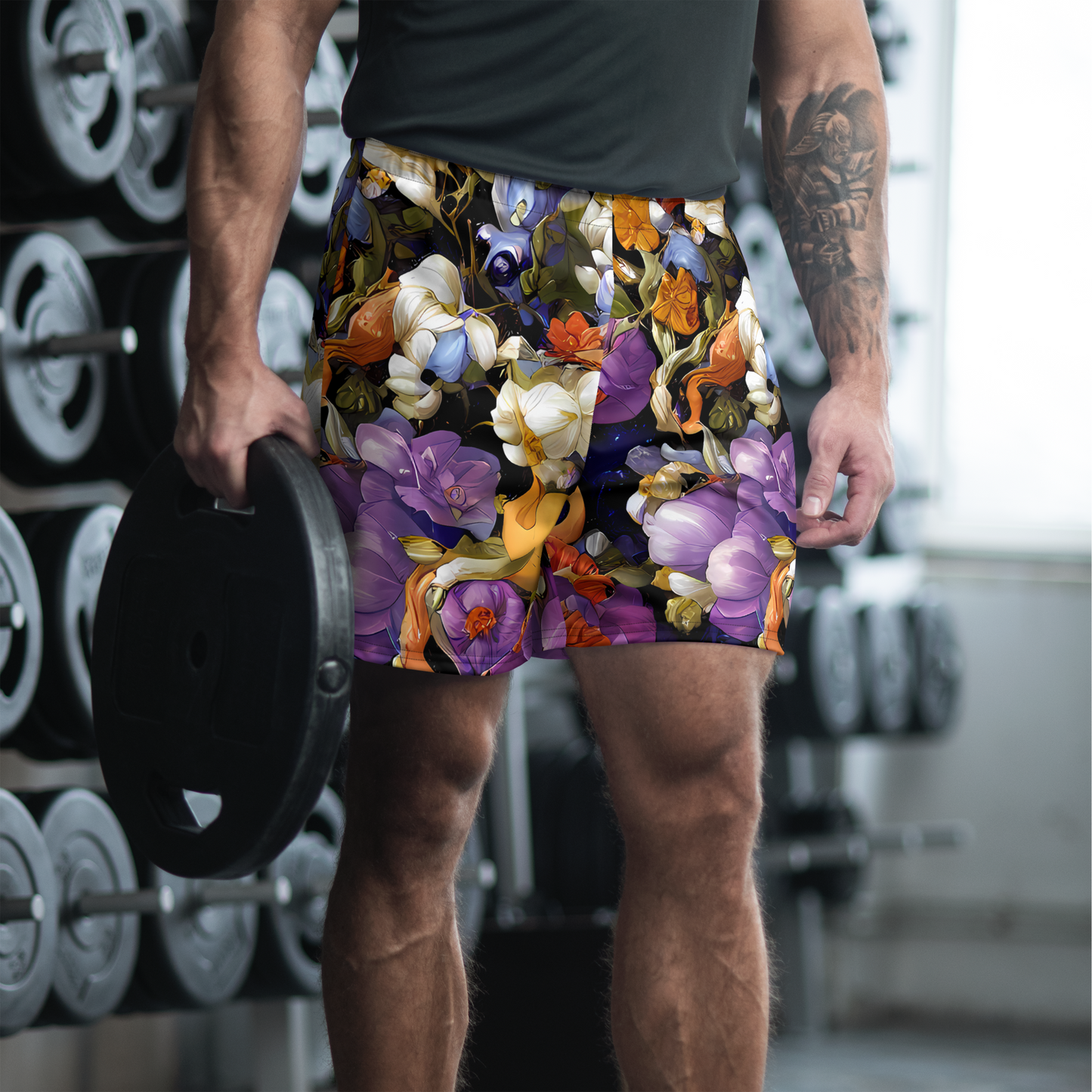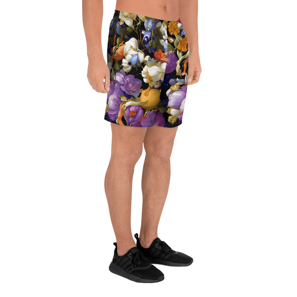 Unleash the artist within and elevate your athletic wardrobe with our Men's Athletic Shorts, featuring an exquisite pattern that weaves together the majesty of a painter's palette. Rich purples, deep blues, and warm oranges bloom across the fabric in a floral symphony that captures the essence of autumnal elegance and classical artistry. Perfect for those who seek to make a bold statement with their active wear, these shorts are not just a piece of clothing, but a wearable masterpiece.