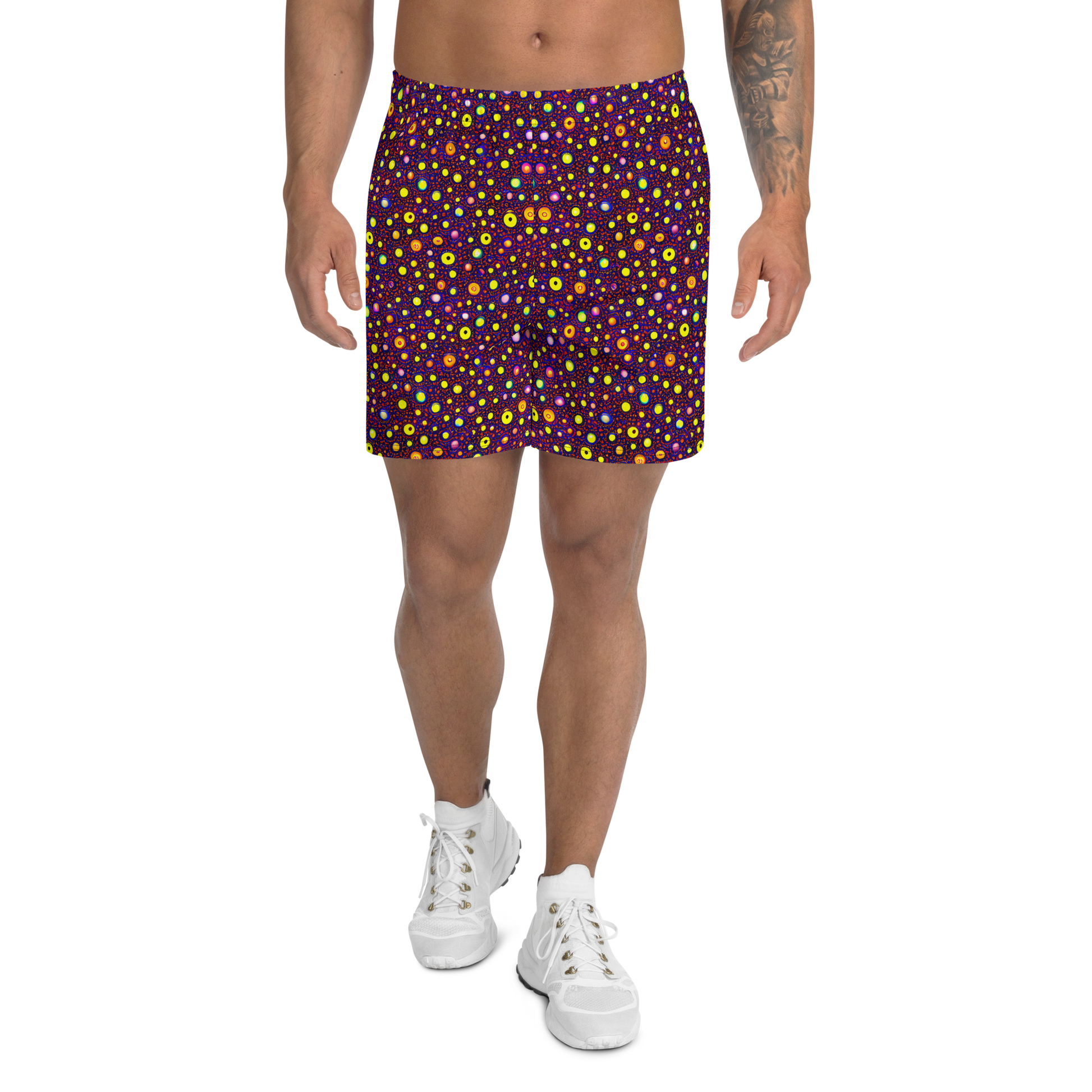 Unleash your adventurous spirit with our Men's Athletic Shorts, featuring the electrifying "Cosmic Dotscape" pattern. This vibrant design, with its interplay of yellows, purples, and oranges, evokes a star-studded galaxy, perfect for those who dare to stand out. Whether you're at a music festival, an art gallery opening, or hitting the gym, these shorts offer a unique blend of style and performance. Made from moisture-wicking, four-way stretch microfiber fabric, they ensure comfort and flexibility, while the functional fit and convenient mesh side pockets keep you ready for any challenge. Elevate your spring and summer wardrobe with shorts that are as bold and dynamic as you are.