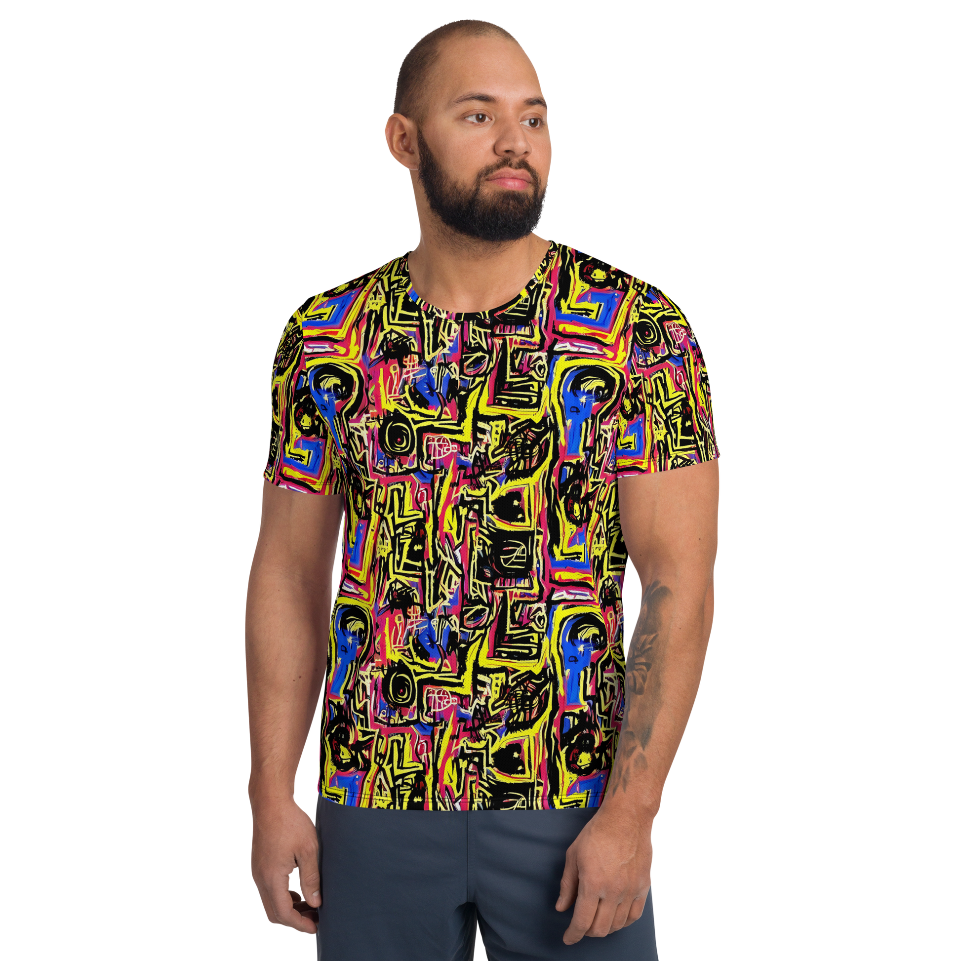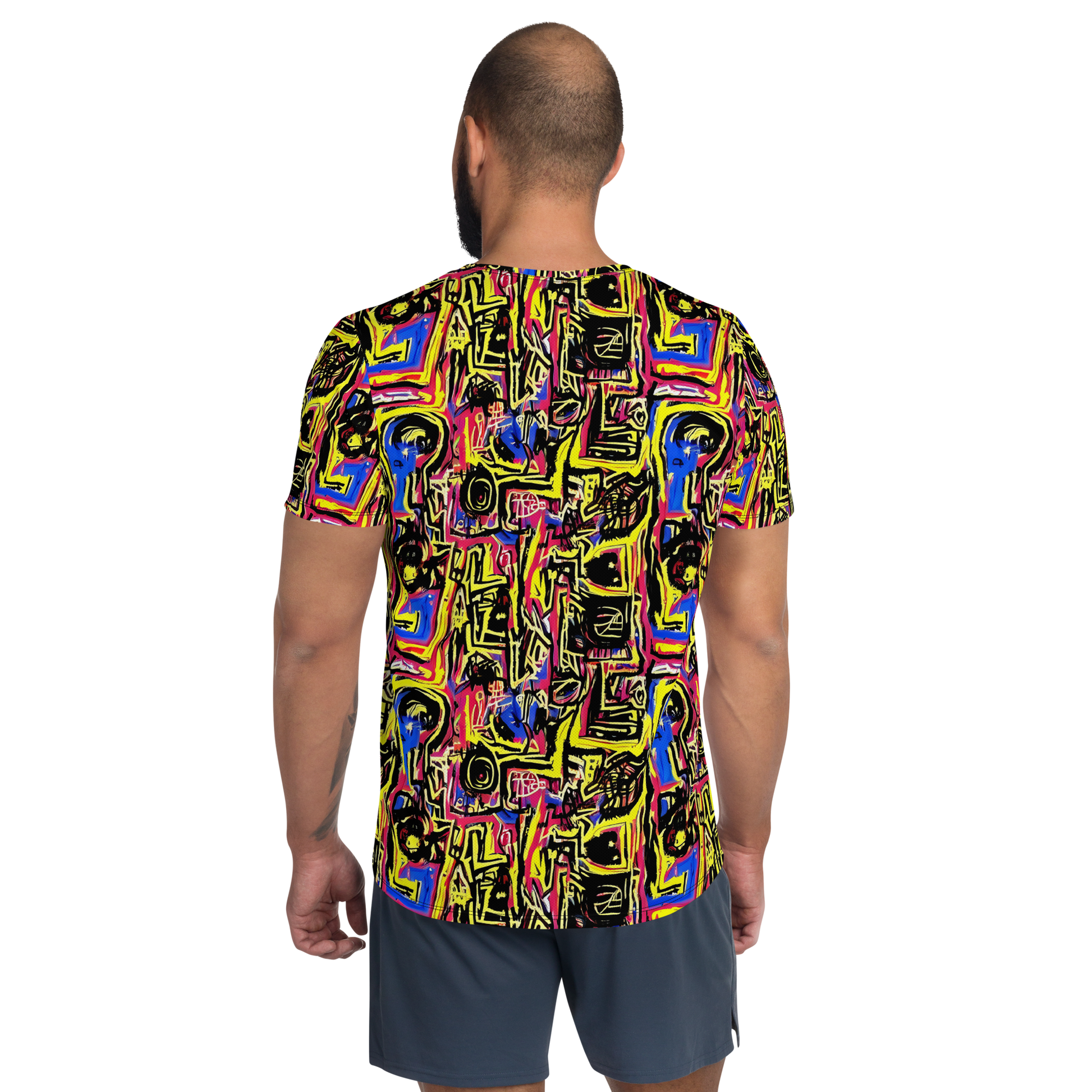 Step into a world where art meets athleticism with our "Beyond the Canvas" Men's Athletic T-Shirt. This vibrant masterpiece, with its electric yellow, bold red, deep blue, and stark black graffiti-inspired design, captures the spirit of movement and rebellion. Perfect for making a statement at eclectic festivals, nightclubs, or art gallery openings, this t-shirt is your go-to for spring and summer adventures. Embrace the bold, adventurous personality within you and let your workouts become a cosmic dance of style and performance.