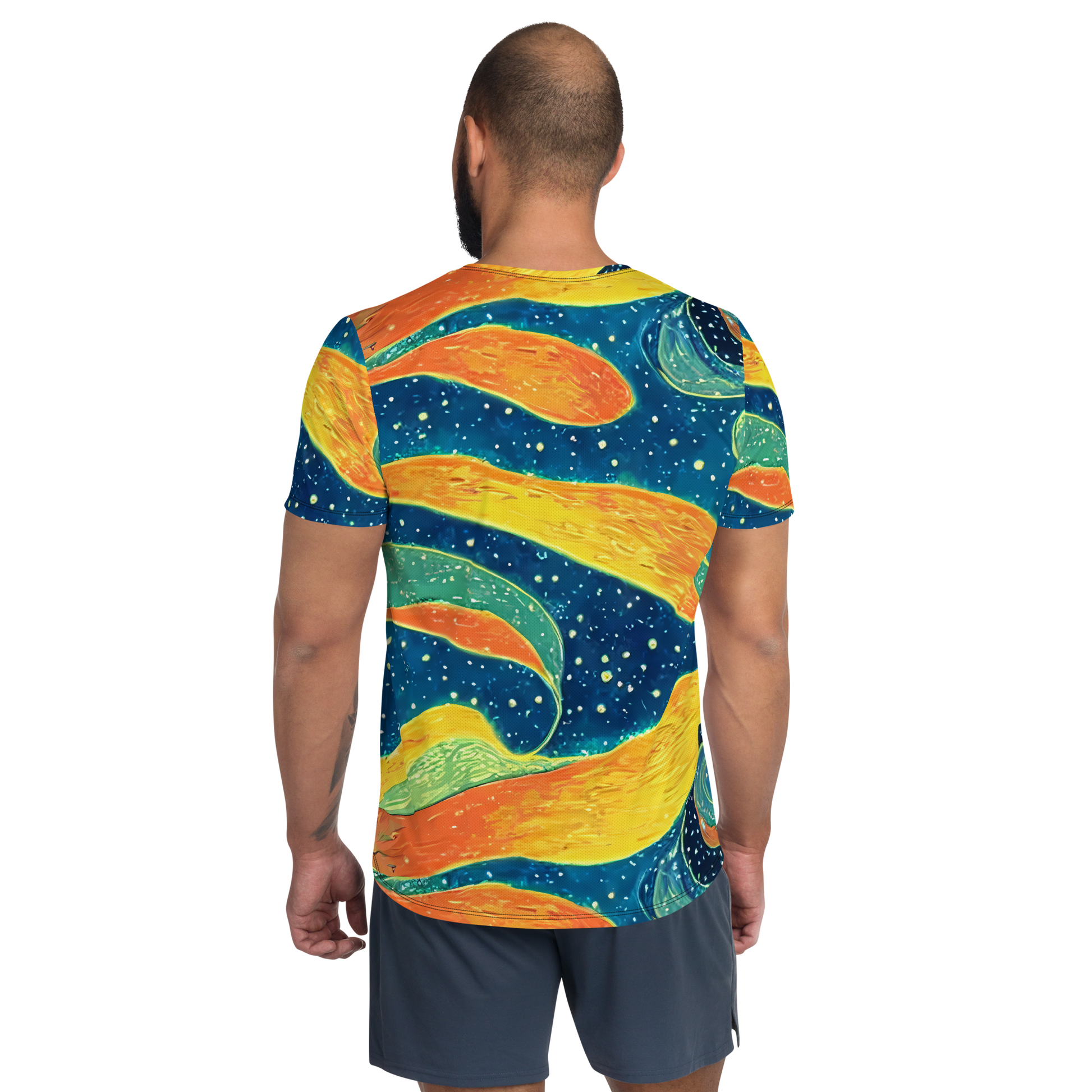 Elevate your workout wardrobe with our Men's Athletic T-Shirt featuring the stunning "Celestial Harmony" pattern. This eye-catching design, with its swirling oranges, yellows, and greens against a deep cosmic blue, captures the essence of adventure and creativity, making it perfect for those who dare to stand out. Whether you're hitting the gym or attending a summer festival, this t-shirt combines performance and style, ensuring you not only look great but feel fantastic too!