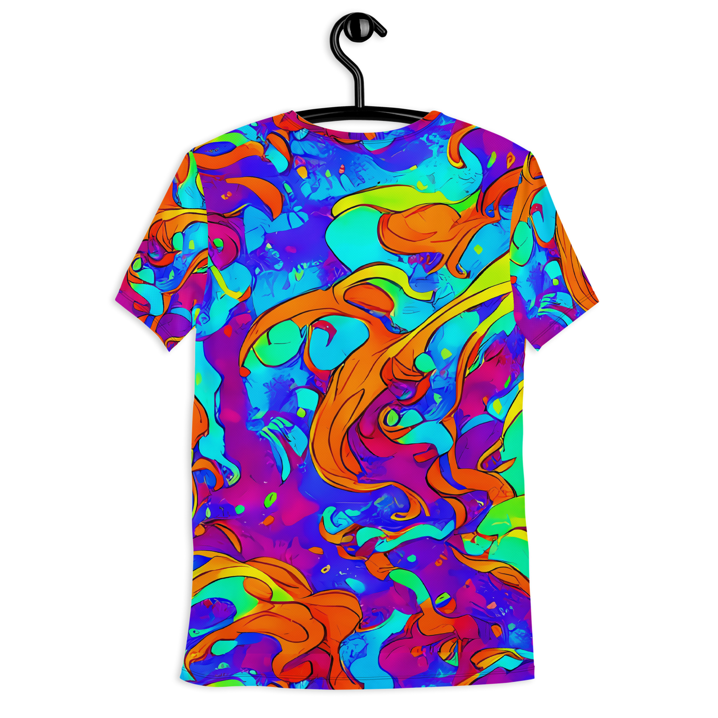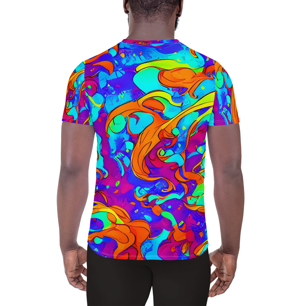 Unleash the vibrant energy of your fitness regime with this captivating athletic tee, featuring a dynamic, art-inspired design. Swirling shapes in fiery orange and sunny yellow leap across a serene blue canvas, creating a visual spectacle that mirrors your own passion for movement. The watercolor-like texture adds an expressive touch to your workout wardrobe, making you stand out whether you're at the gym or enjoying an outdoor adventure.
