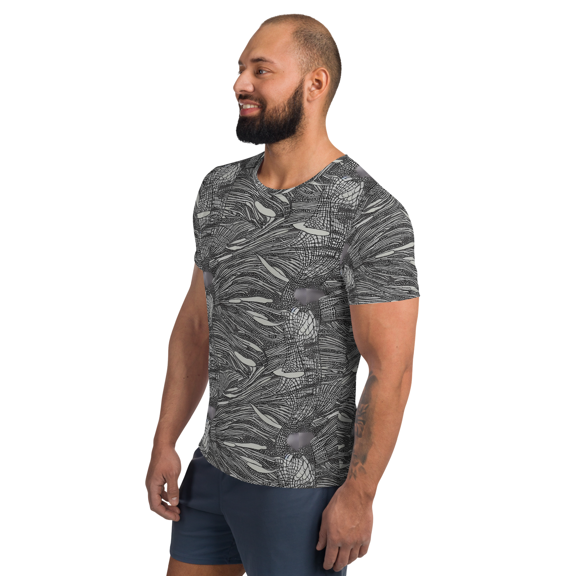 Elevate your workout wardrobe with our Men's Athletic T-Shirt featuring the stunning "Sable Currents" pattern—a mesmerizing blend of swirling monochrome lines that captures the cosmic elegance of interstellar waves. This unique design not only sets you apart but also embodies the spirit of a bold, enigmatic personality. Perfect for both high-performance training and stylish outings, this t-shirt is your go-to for making a statement while you conquer your fitness goals.