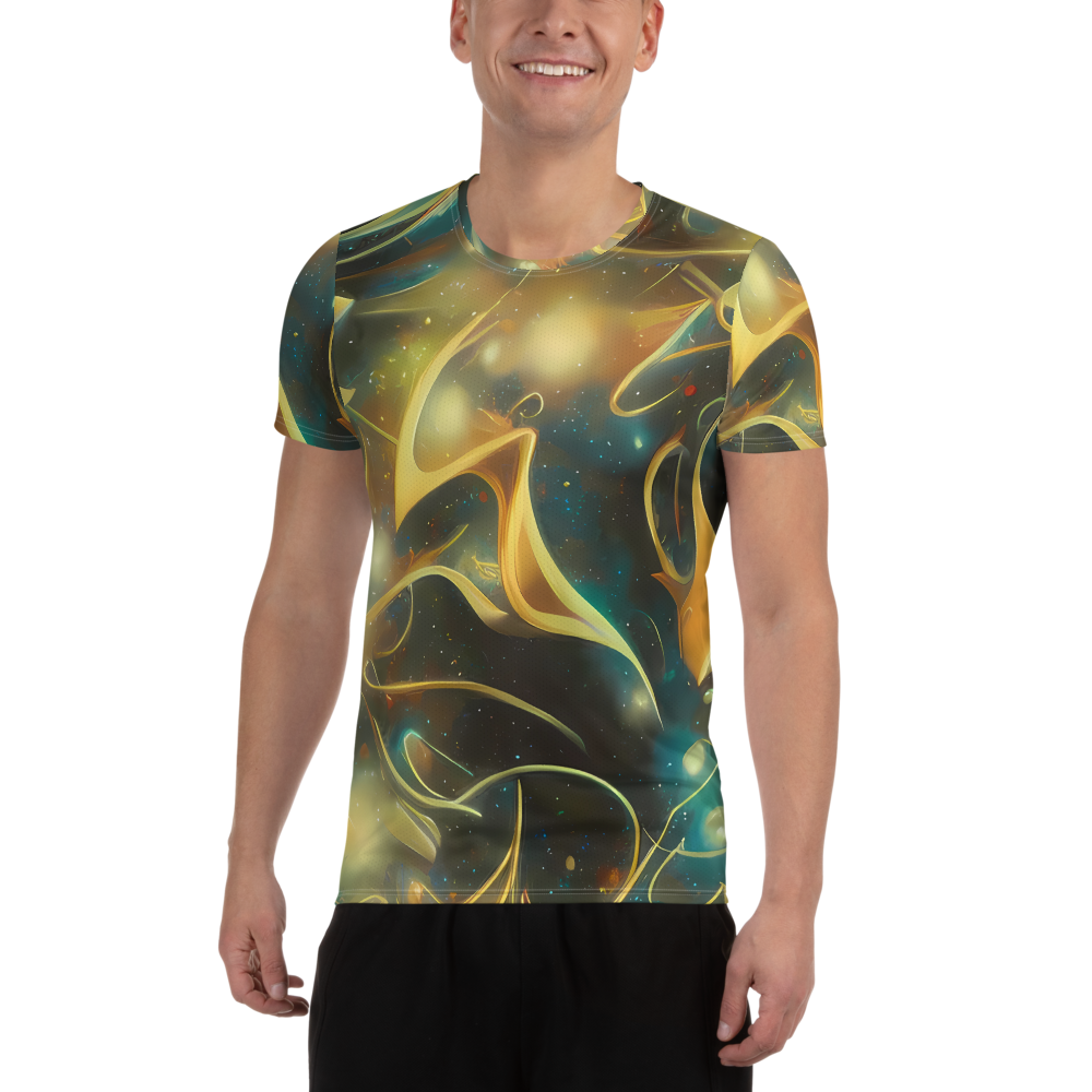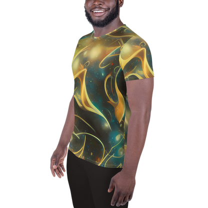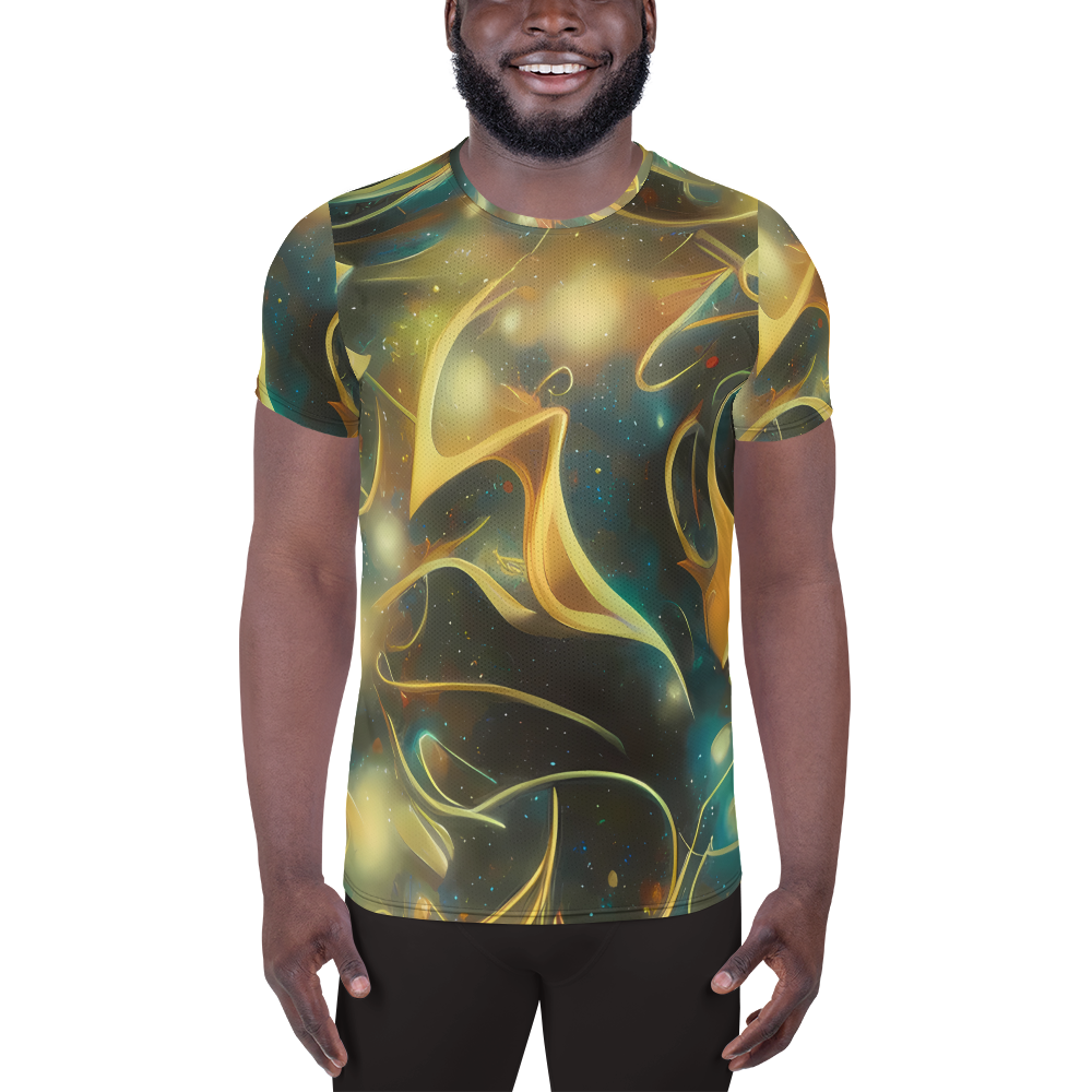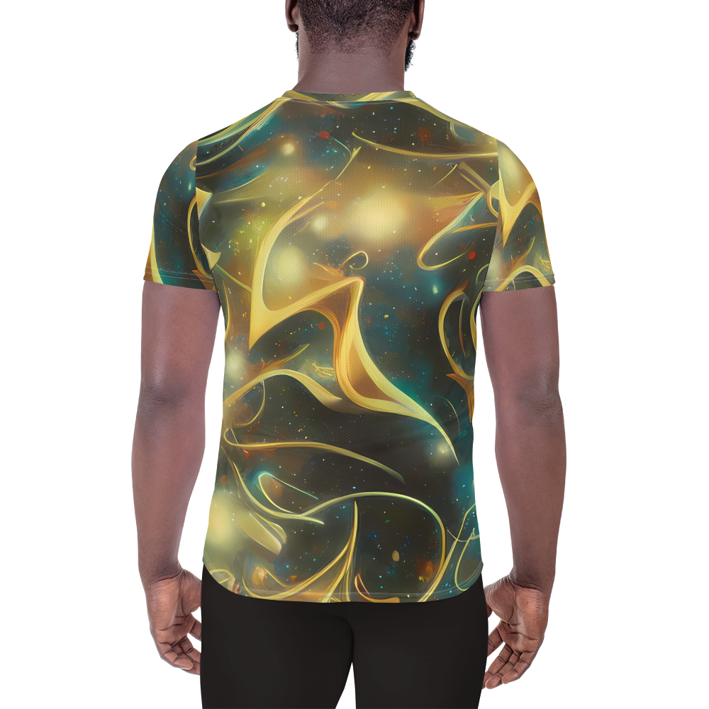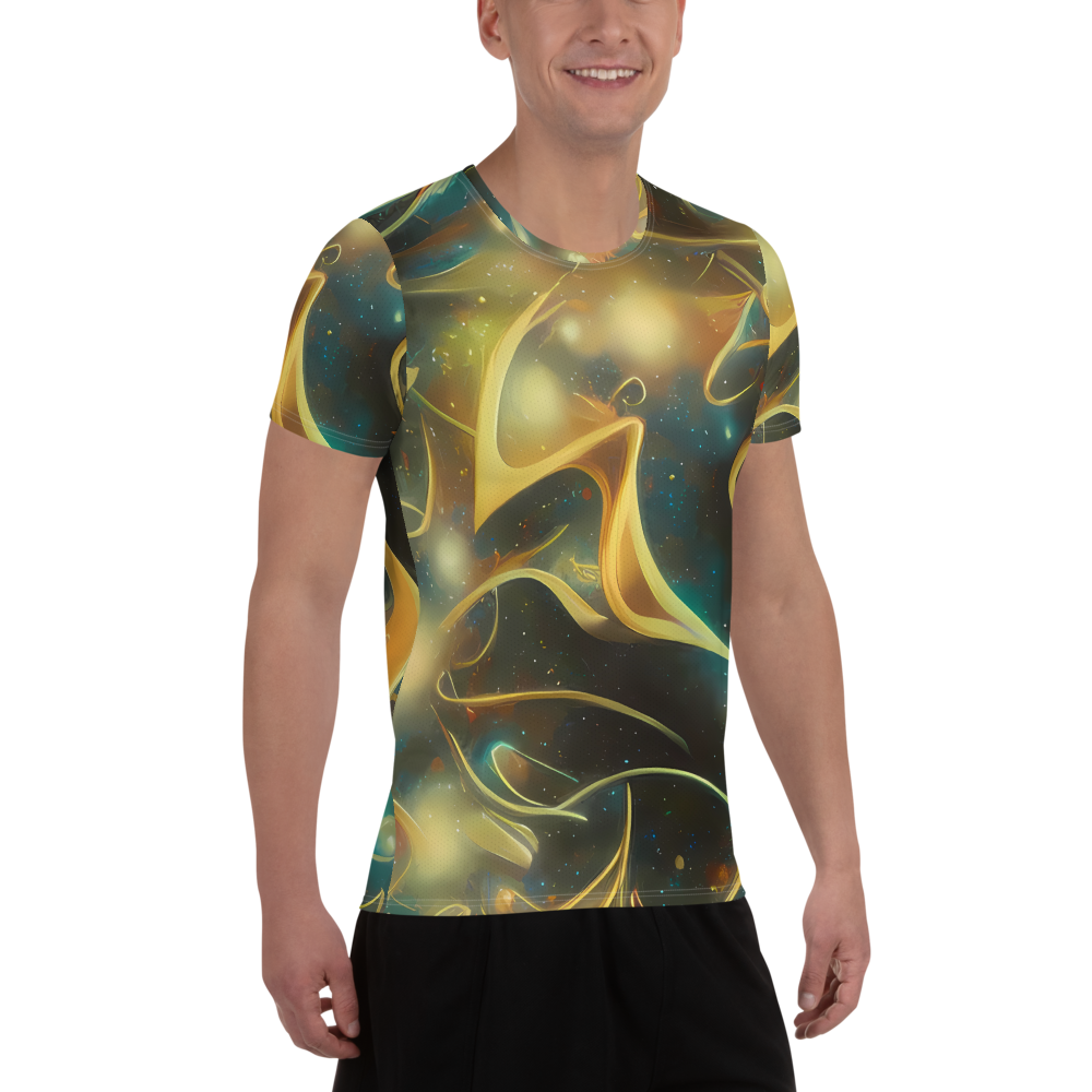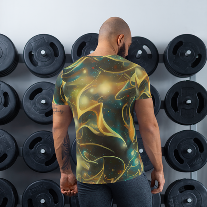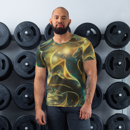 Step into the cosmos with our "Whispering Galaxies" Men's Athletic T-Shirt – where performance meets the enigma of space. The golden swirls and starry backdrop of this unique AI-created design will have you standing out as you push your limits. It's not just a workout tee, it's a wearable piece of art, inspired by the mystique of the universe and the luxury of movement.