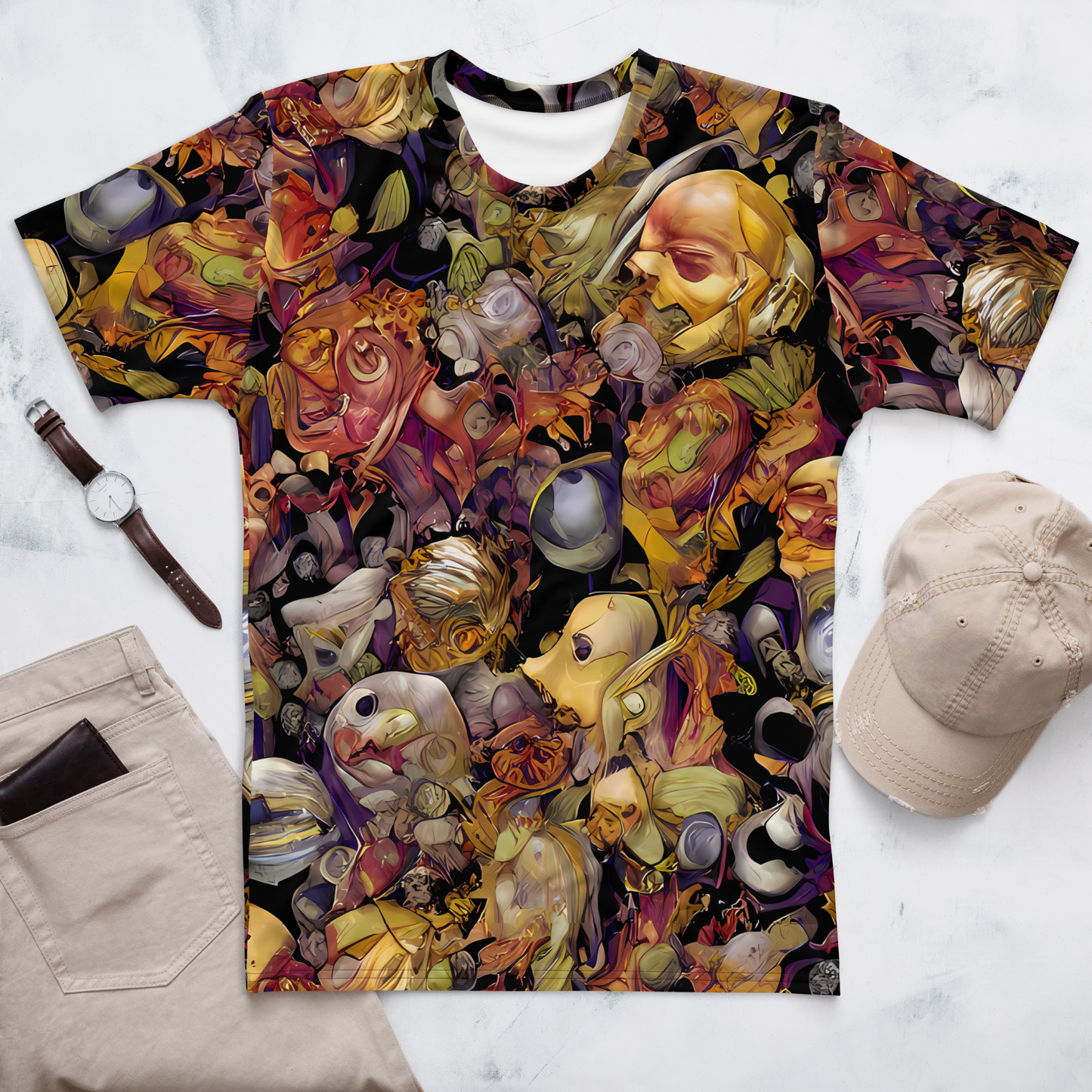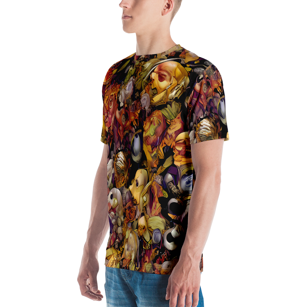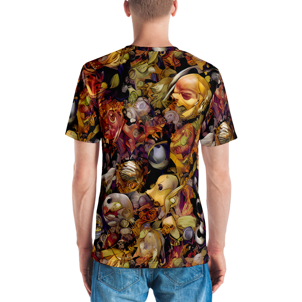 Infused with the essence of autumnal opulence, this Men's Crew Neck T-Shirt boasts an enchanting mosaic of nature's bounty. The playful energy of whimsical faces formed by fruits and vegetables, set against a tapestry of warm golds, ambers, and deep purples with cool silver and gray contrasts, invites a touch of baroque sophistication to your wardrobe. Perfect for those with an eye for art and a penchant for fashion, this tee is your canvas for self-expression, especially as the leaves begin to turn.