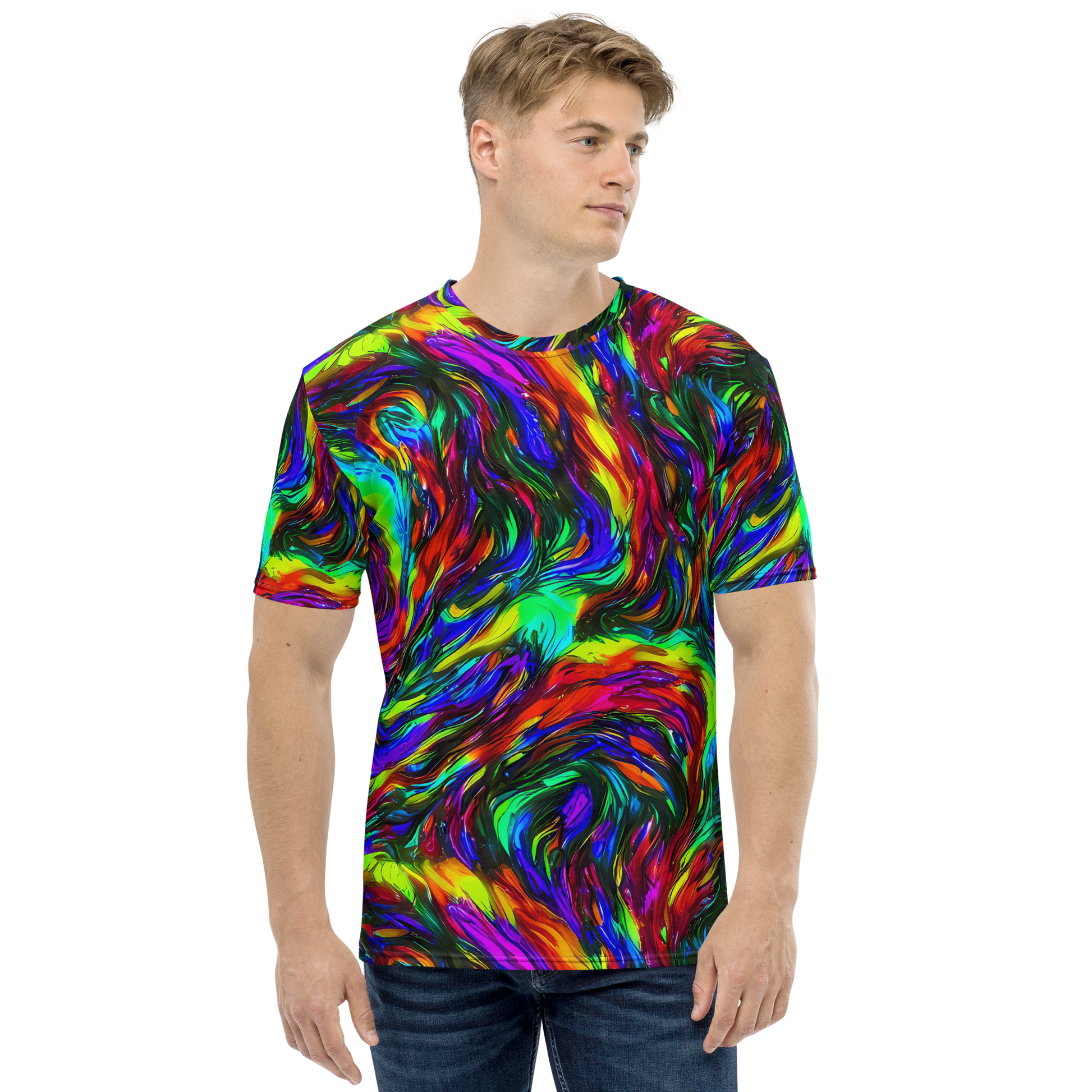 Experience a vibrant tapestry of swirling colors with our Men's Crew Neck T-Shirt, featuring the stunning "Calraet Swirl" pattern. Bold reds, deep blues, and luminous greens come together in an artistic frenzy that not only makes a statement but also reflects your unique style. This tee is not just an article of clothing; it's a canvas for your individuality, perfect for art events, spring festivals, or any casual yet spirited gathering. Crafted for supreme comfort and designed to last, it’s time to elevate your everyday look!