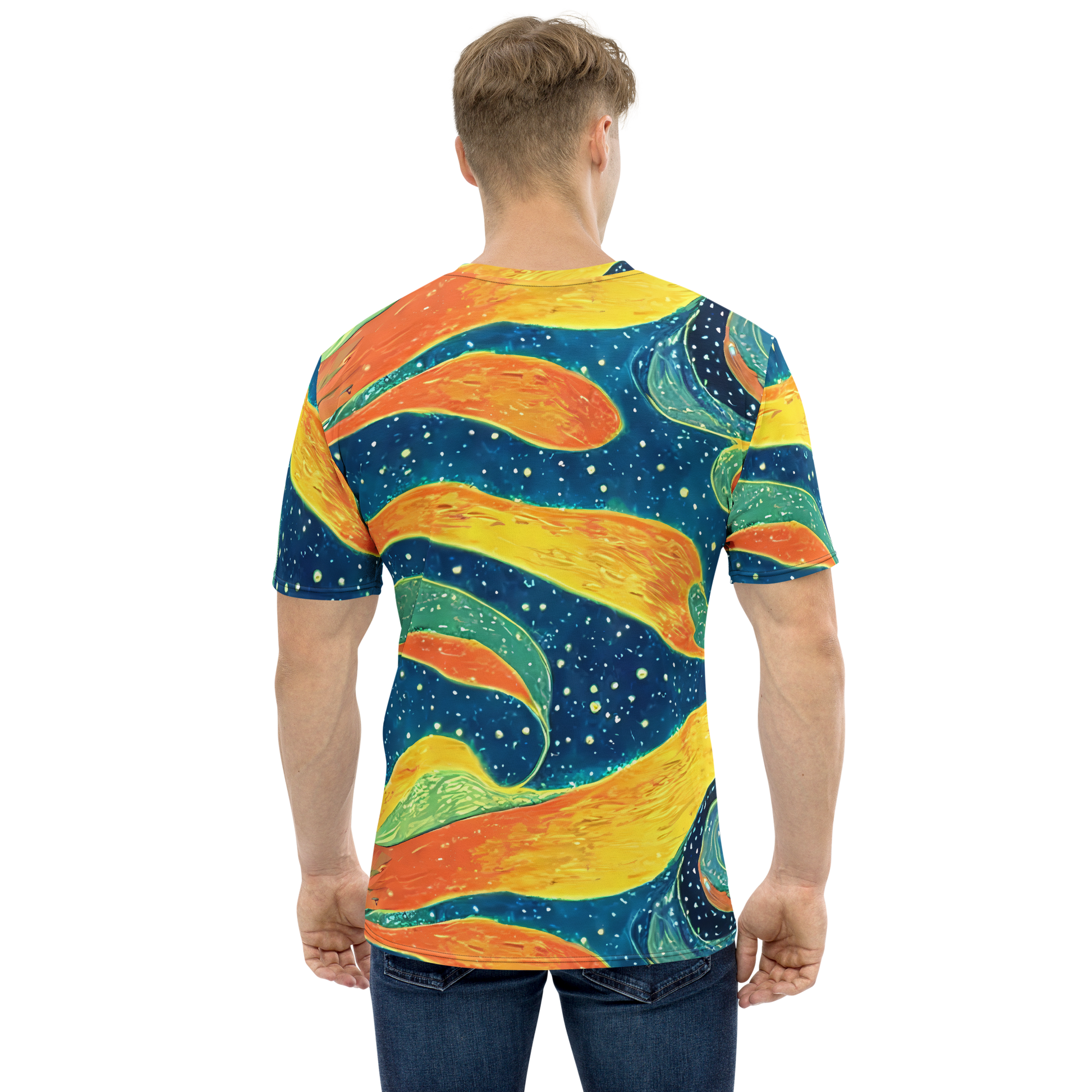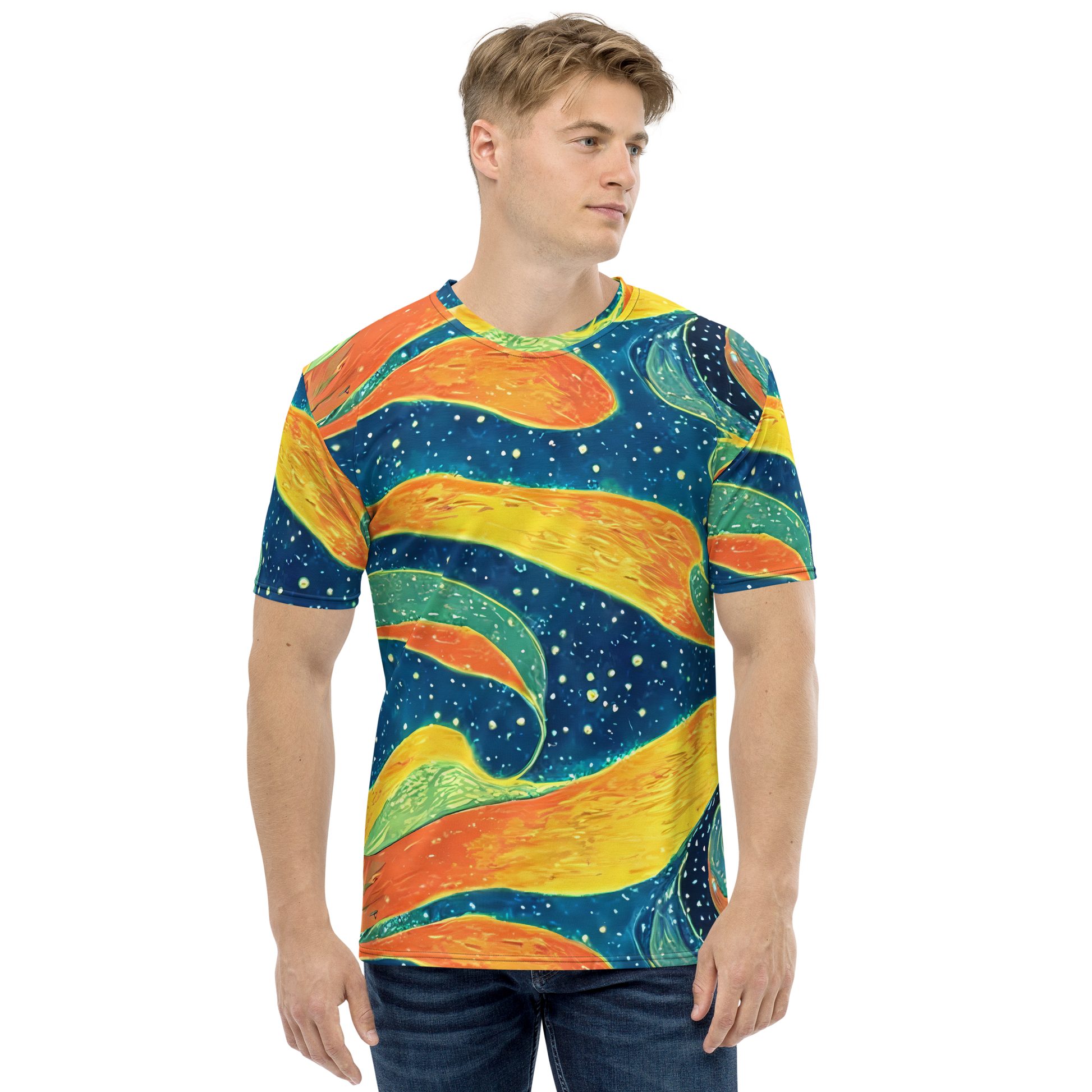 Unleash your inner adventurer with our Men's Crew Neck T-Shirt featuring the mesmerizing "Celestial Harmony" pattern. This vibrant design, a swirling tapestry of oranges, yellows, and greens against a deep cosmic blue, captures the essence of a starry night sky, inspiring creativity and a sense of wonder. Perfect for art gallery openings or summer festivals, this tee not only showcases your unique style but also envelops you in unparalleled comfort.