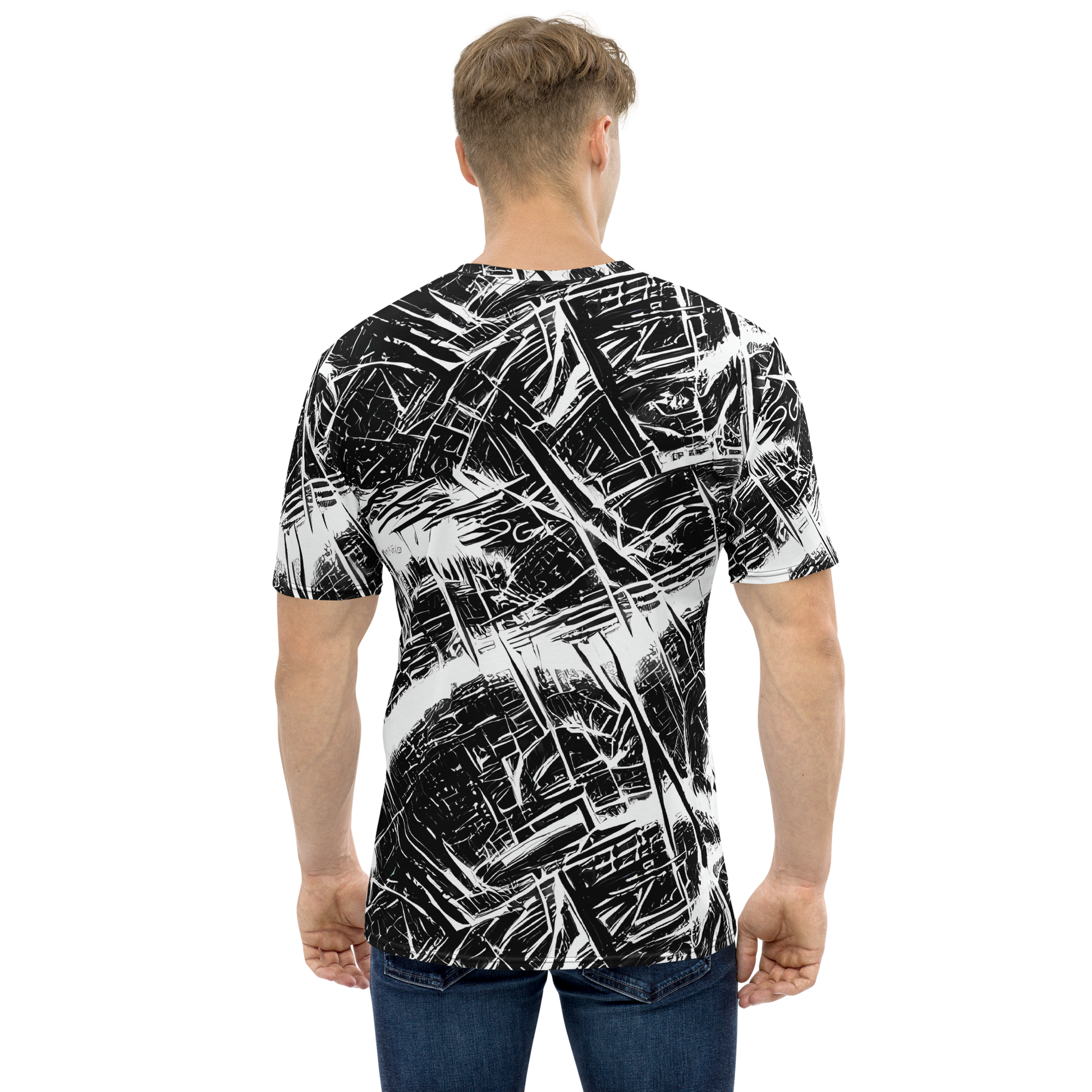 Step into the spotlight with our Men's Crew Neck T-Shirt, featuring an exclusive pattern inspired by urban architectural sketches. This tee captures the essence of modernist grandeur with its bold black and white geometric lines, making it the ultimate statement piece for any art gallery opening, fashion-forward event, or urban soirée. Perfect for fall and winter, this shirt is designed for those who appreciate the fusion of art and architecture in fashion.