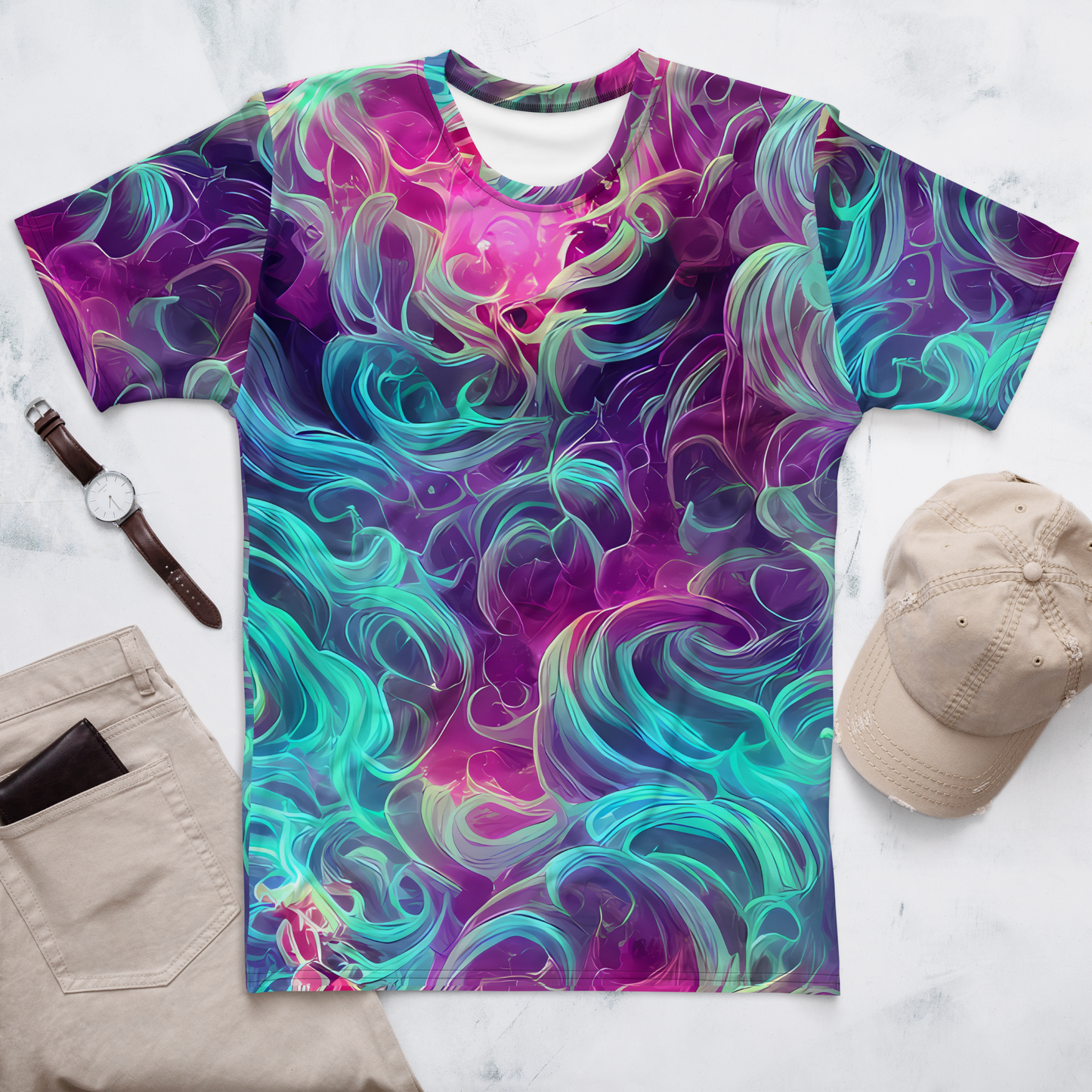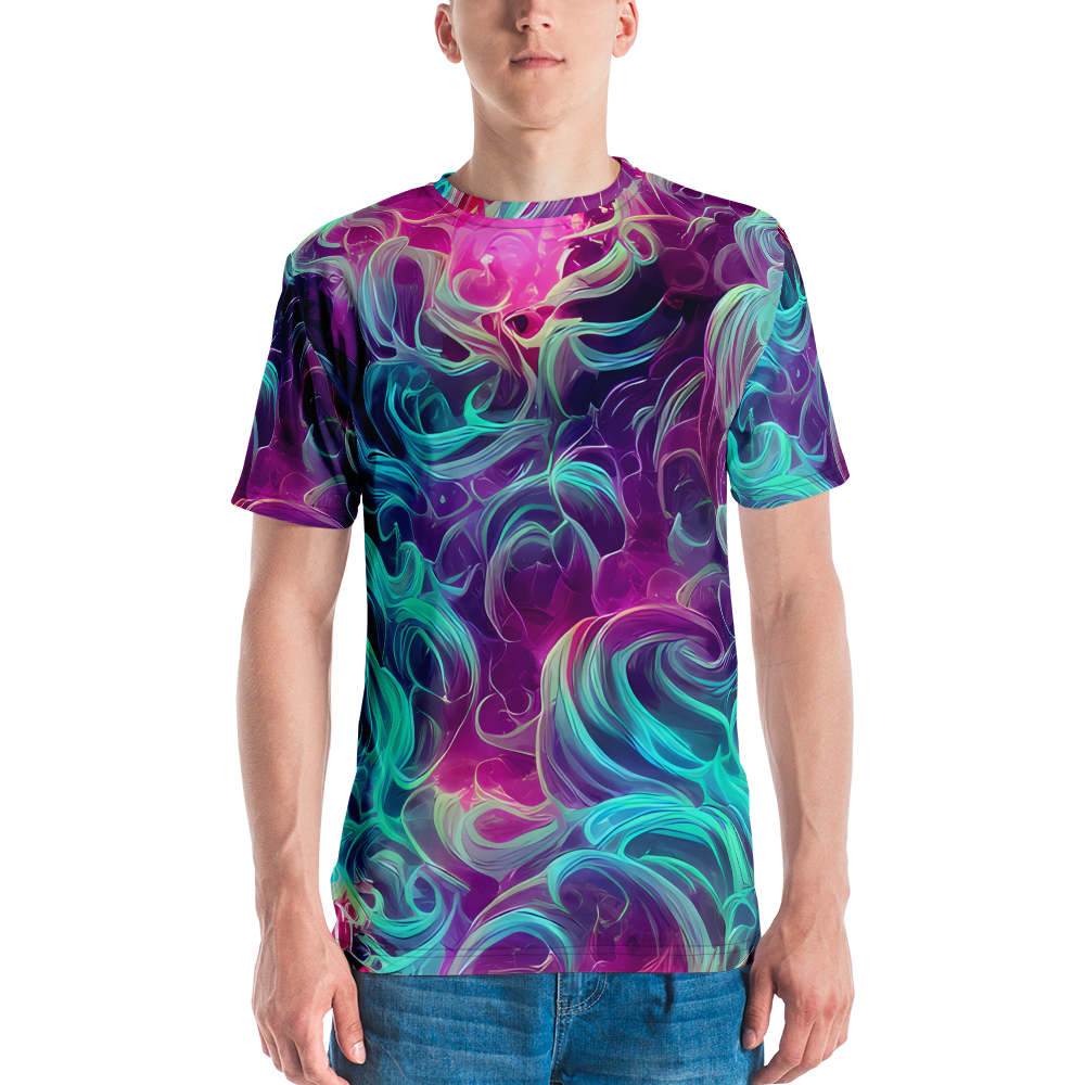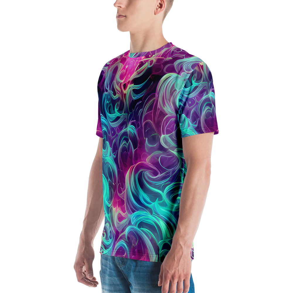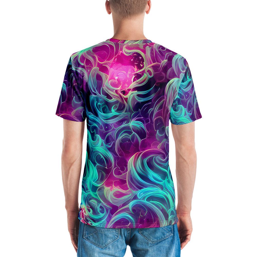 Step into a universe of style with our Men's Crew Neck T-Shirt, where the mystique of space meets the allure of a blooming garden. Swathed in a pattern that captivates with its interplay of cosmic nebulas and ethereal floral designs, this shirt is a celebration of color and creativity. The lush pinks, blues, and purples of the design create a texture that is as soft as petals and as infinite as the night sky. Perfect for those who carry an artistic soul, this tee is your ticket to standing out at any festival or creative gathering.