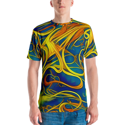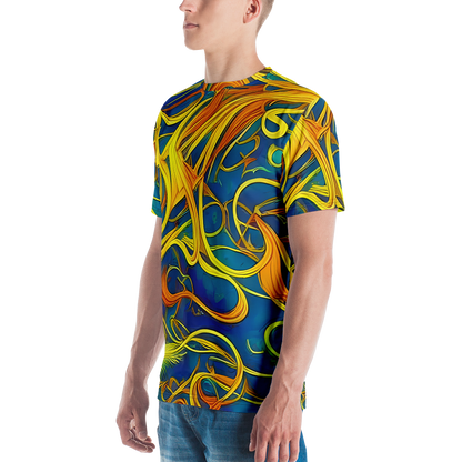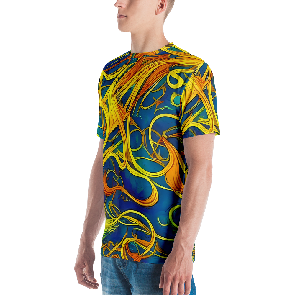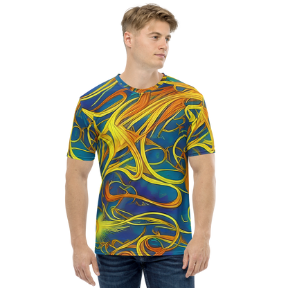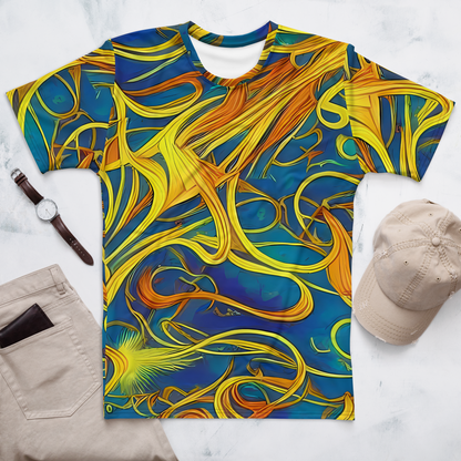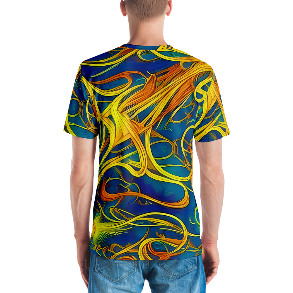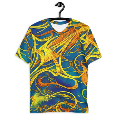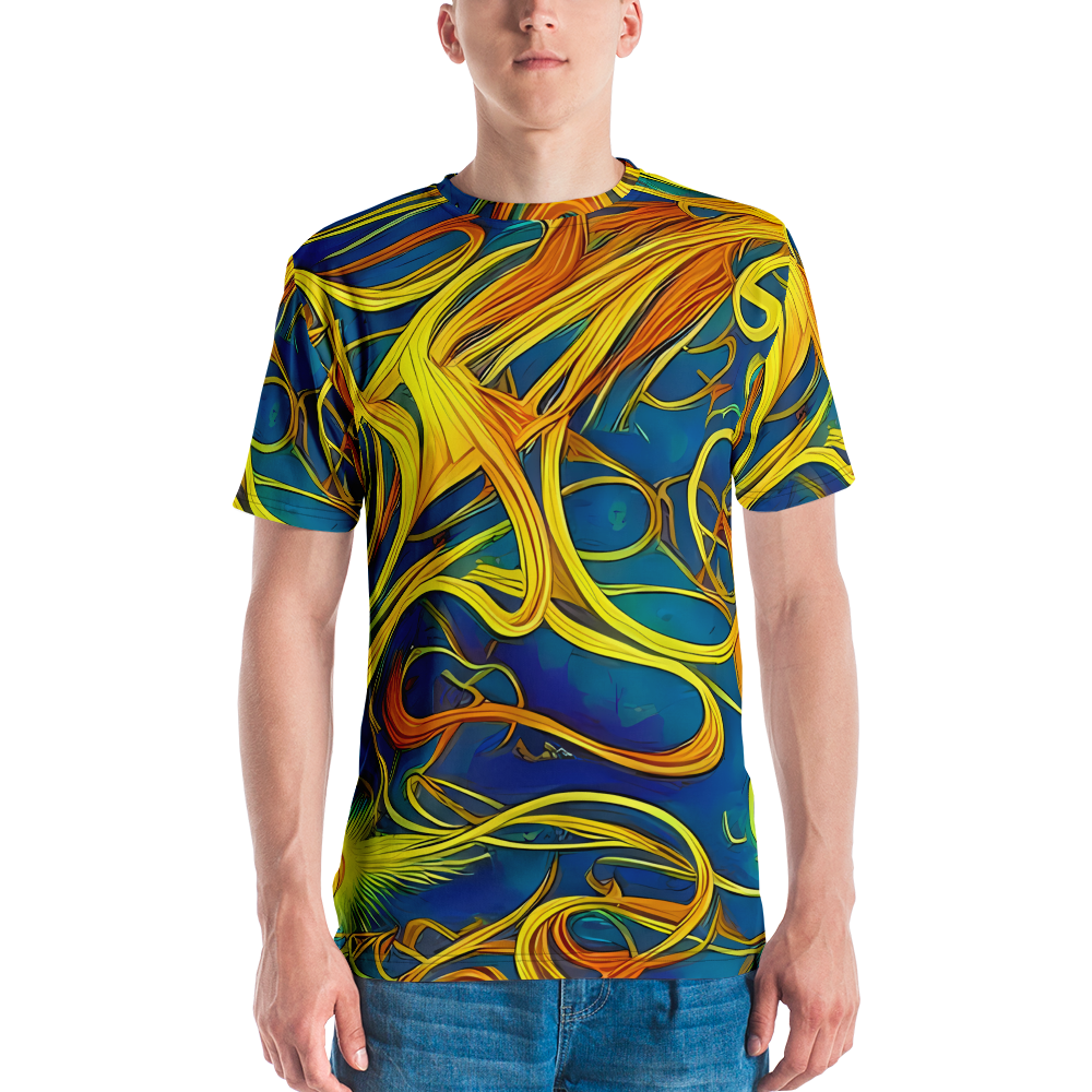 Step into the realm of art and comfort with our Men's Crew Neck T-Shirt adorned with the mesmerizing "Morgan's Entwined" pattern. Inspired by the magical interplay of Evelyn De Morgan's visionary art, this shirt weaves together the rich blues and warm golden yellows into a tapestry of movement and connectivity. Perfect for those who carry a love for historical artistry and bold expression, this tee is a statement piece for spring and autumn gatherings, or any day you wish to stand out.