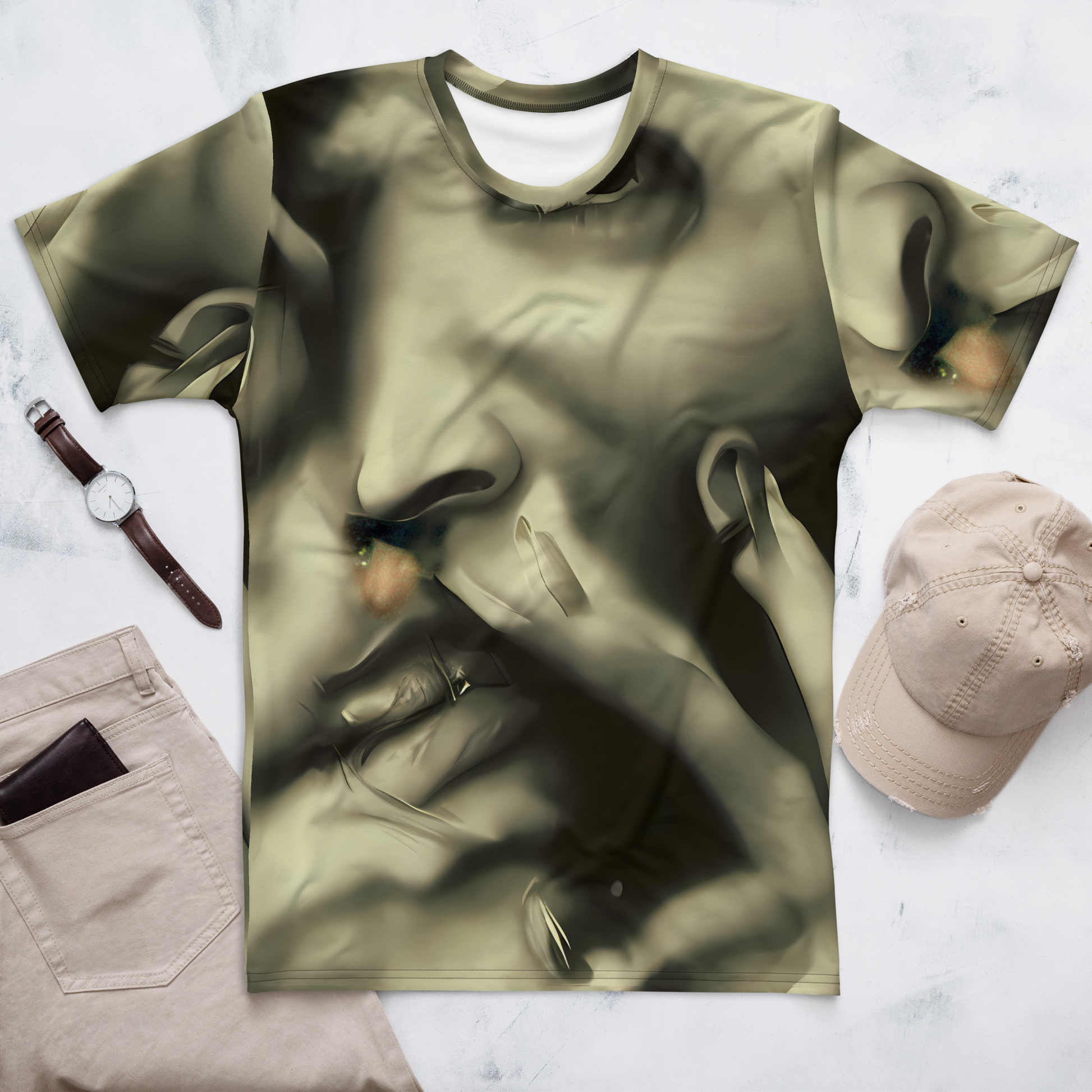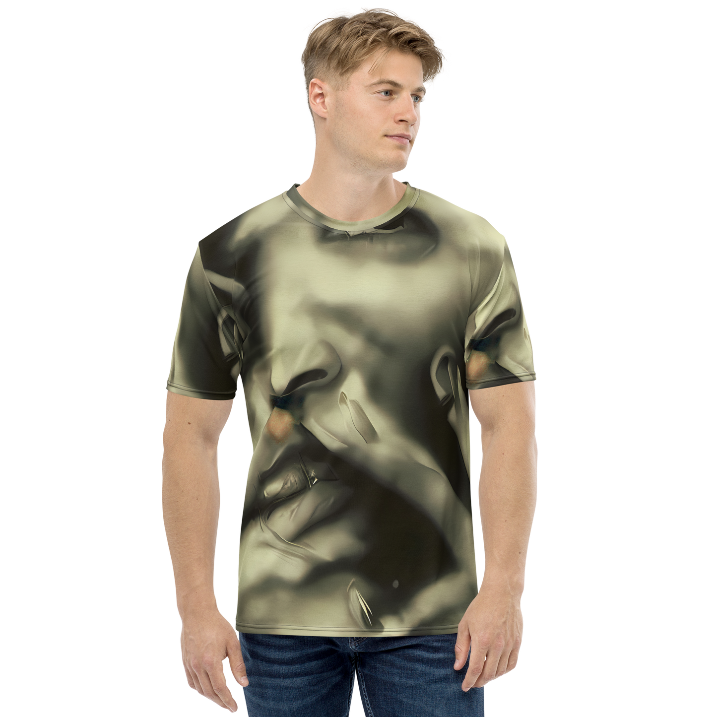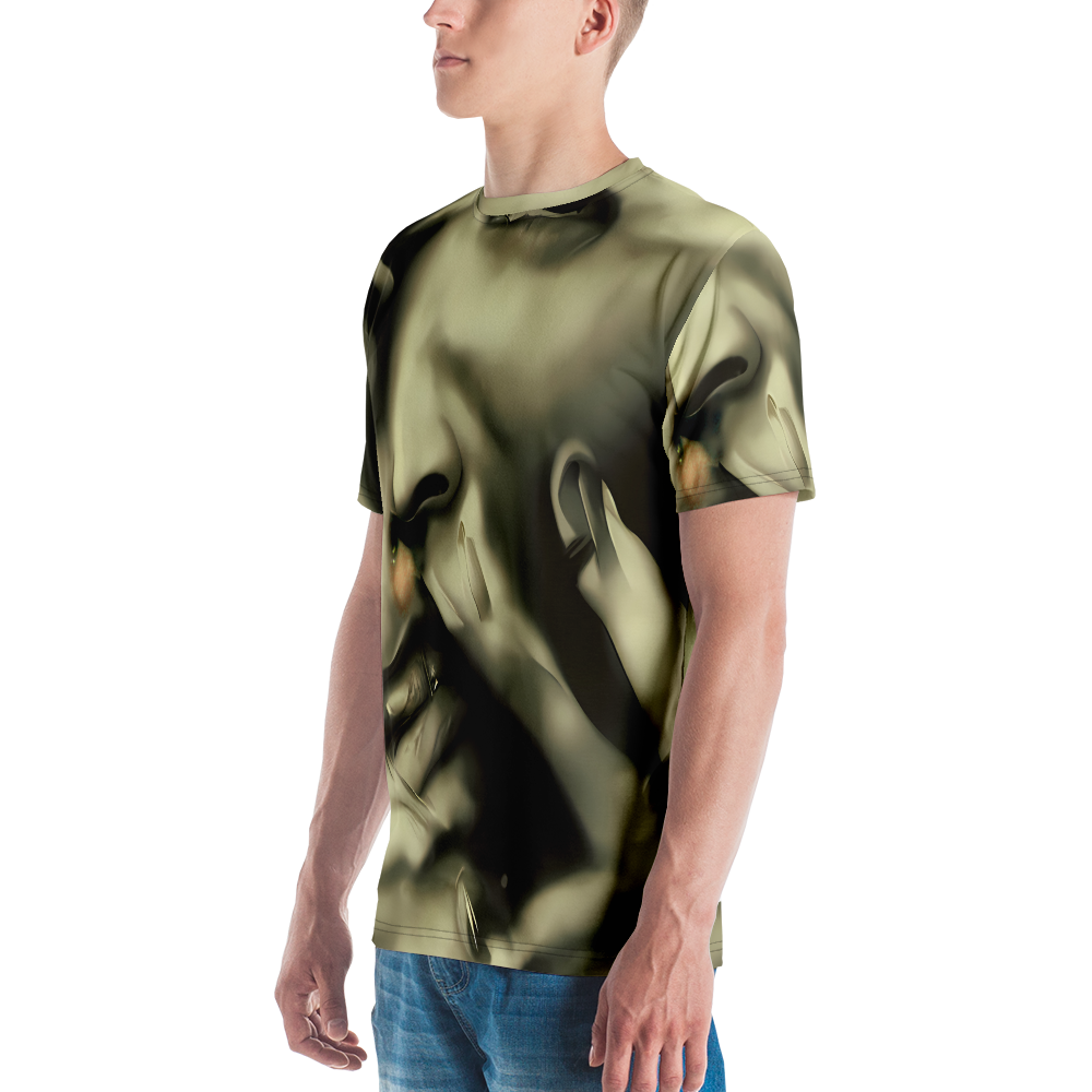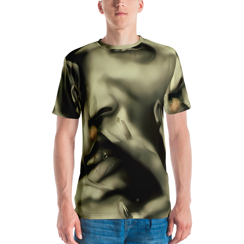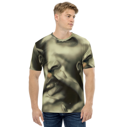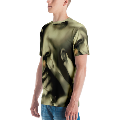Step into the realm of sophistication with our Men's Crew Neck T-Shirt adorned in the "Newtonian Whisper" pattern. This shirt is not just a garment but a statement, with its golden sepia tones and fluid shapes that whisper tales of mystery and allure. Inspired by the provocative elegance of Helmut Newton and the muted opulence of Brad Kunkle's art, this tee is designed for the bold and introspective, perfect for high-end evening events or avant-garde fashion gatherings. It's a celebration of subtle sensuality and autumnal introspection, tailored for those who dare to stand out.