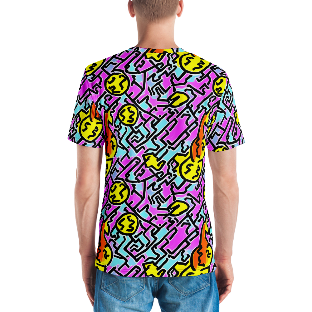 Infuse your wardrobe with the electrifying essence of street art. This crew neck T-shirt is splashed with a dynamic pattern that channels the raw energy of neon-lit nights and the untamed spirit of urban artistry. With its striking neon pink, electric yellow, and bold black scribbles set against a cyan canvas, this tee is a wearable manifesto of self-expression. It's not just a garment—it's a statement piece, perfect for those who dare to stand out at music festivals or in everyday adventures.