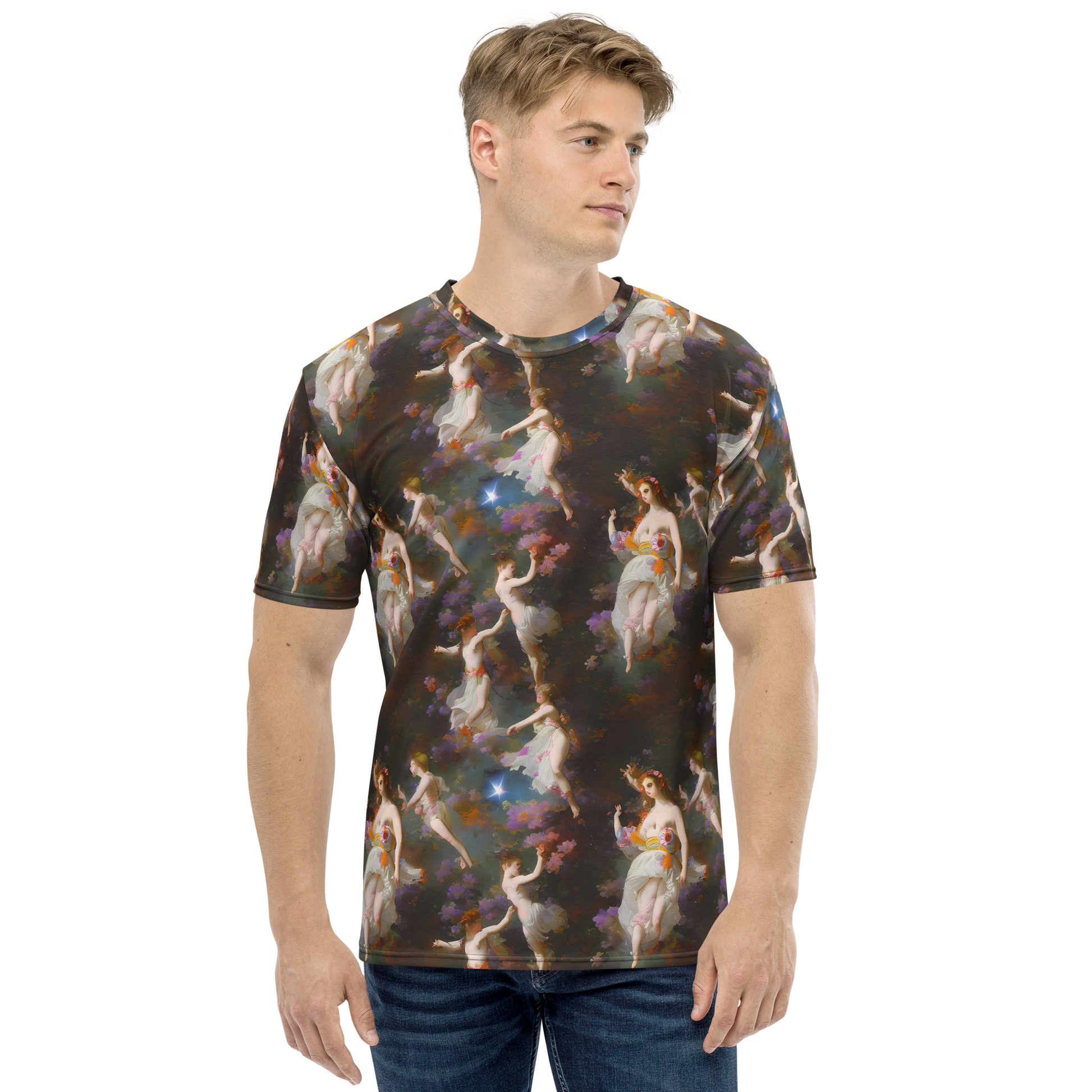 Step into the realm of elegance and cosmic allure with our Men's Crew Neck T-Shirt, adorned with a design that marries historical romanticism with modern mystique. Draped in a tapestry of deep space hues and ethereal figures, this tee captures the essence of graceful movement and otherworldly sophistication. It's a garment that not only stands out at high-fashion events but also adds a touch of whimsy to your everyday style. Make a bold statement that echoes through time and space with this enchanting addition to your wardrobe.