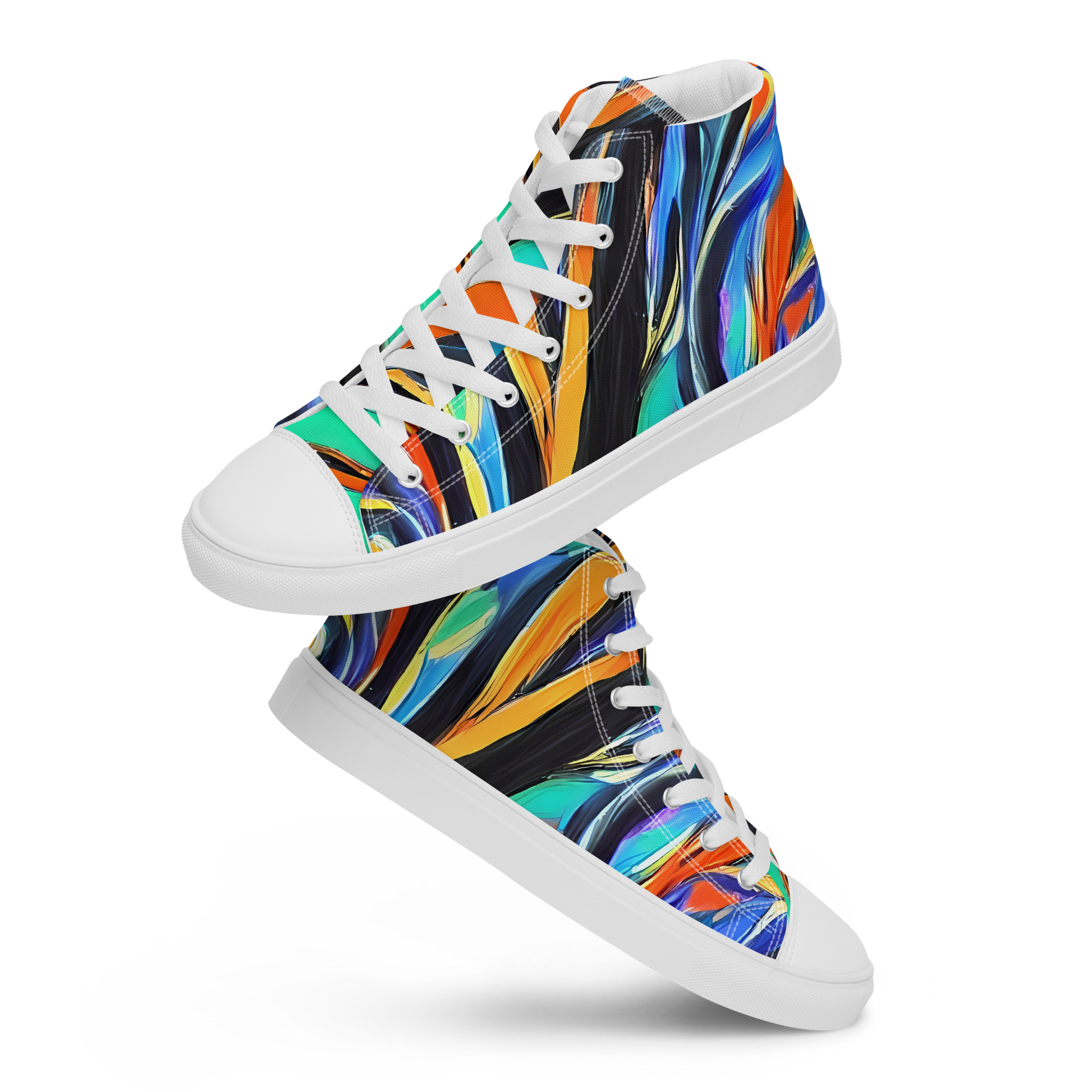 Immerse yourself in the essence of wild creativity with our High Top Canvas Shoes, swathed in an exhilarating pattern that captures the untamed beauty of the natural world. Swirls of vivid blues, oranges, and greens dance across the fabric, bringing to life an artistic vision that's as fearless as it is free-spirited. These shoes are not just a fashion statement; they are a tribute to those who dare to express themselves boldly. Perfect for art lovers and the fashion-forward, these high tops will be your go-to for making an impression that lasts.