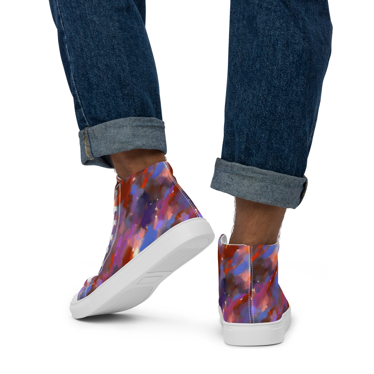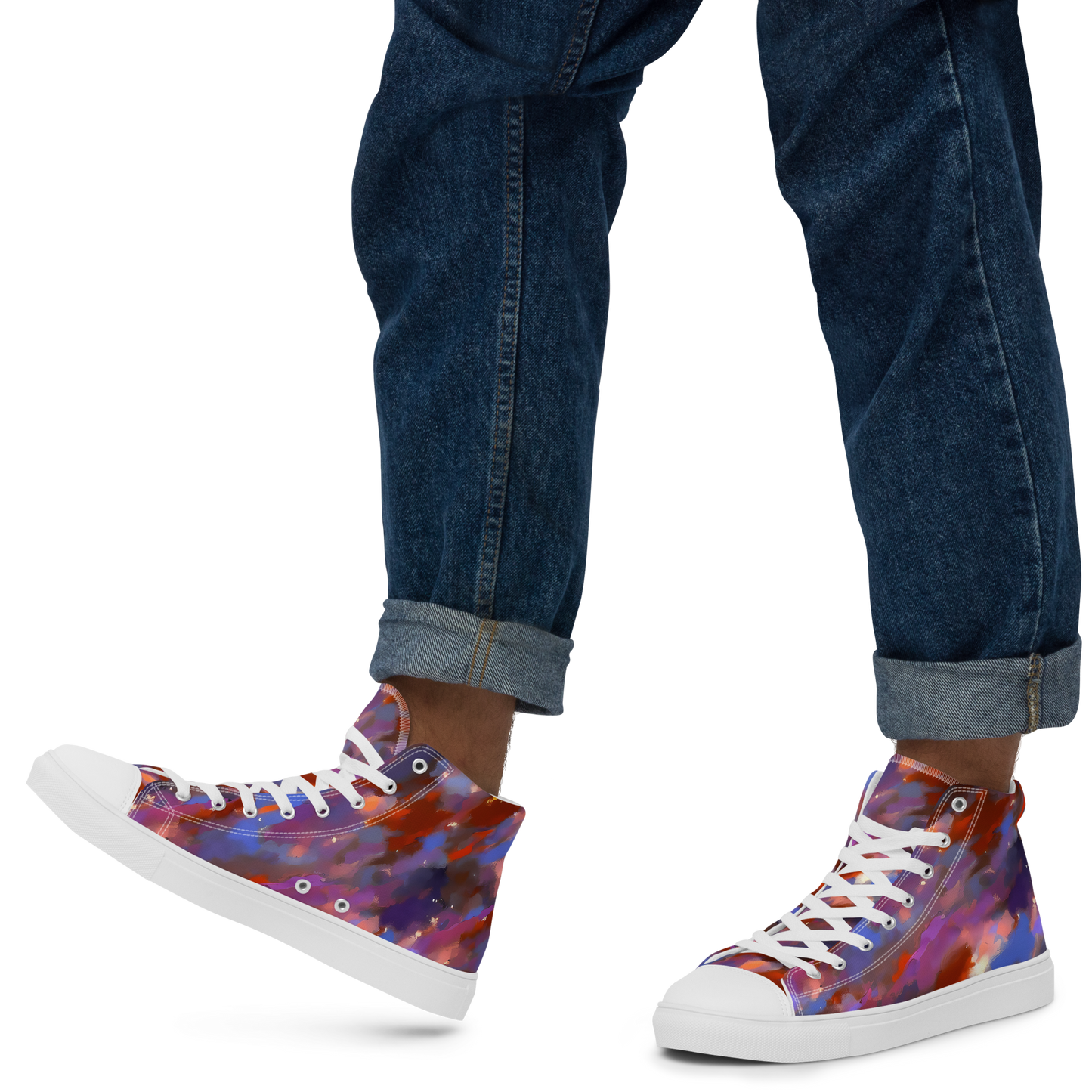 Step into a universe of style with our Men's High Top Canvas Shoes, featuring a mesmerizing blend of vibrant purples, deep blues, fiery oranges, and soft whites. Inspired by the boundless beauty of the cosmos, these shoes evoke a dynamic and dreamy effect, perfect for artistic souls and free spirits. Whether you're at a creative event, music festival, or just enjoying a casual gathering, these shoes will elevate your look and spark your imagination.