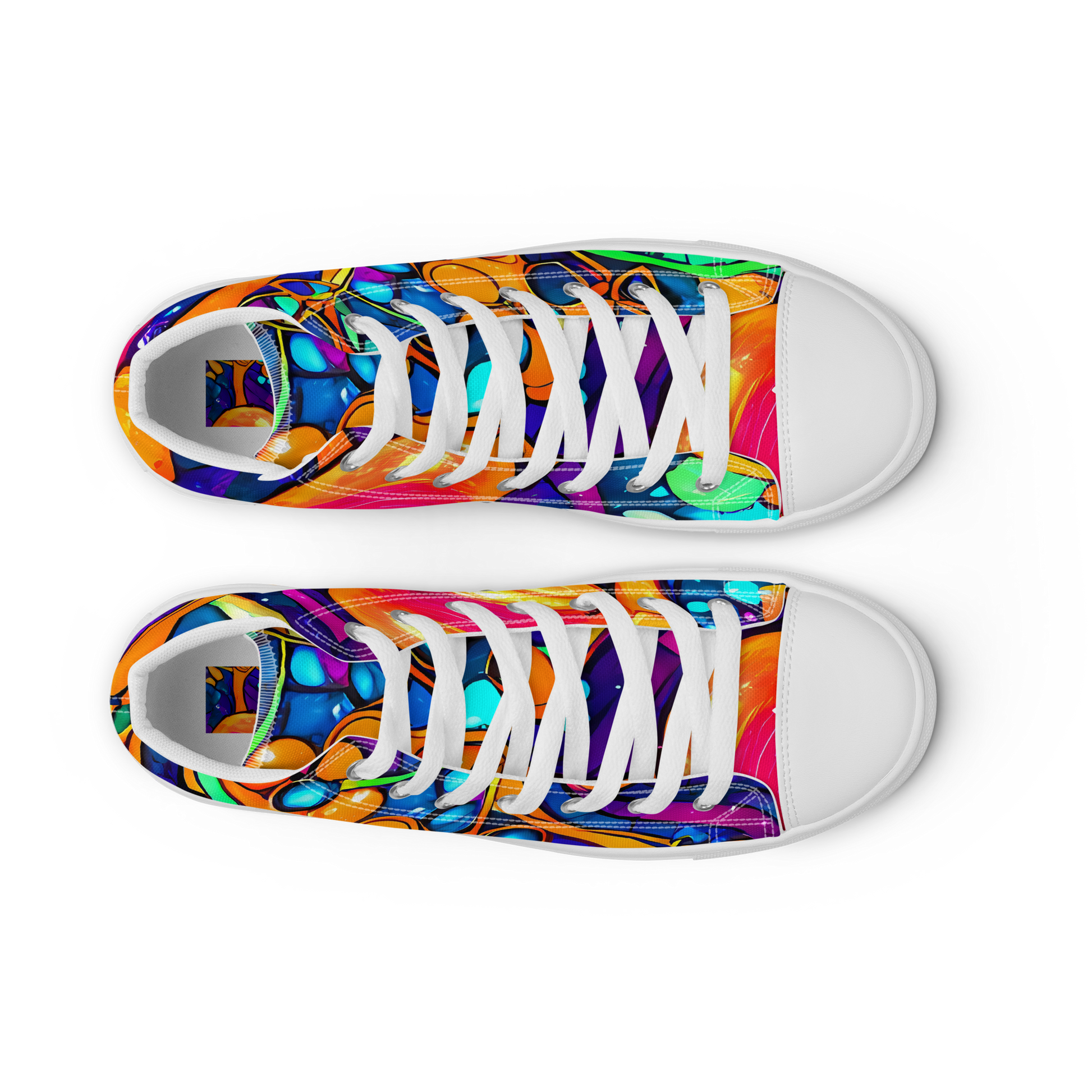 Step into a cosmic journey with our Men's High Top Canvas Shoes, featuring the mesmerizing "Iridescent Nebula" pattern. This vibrant design showcases a kaleidoscope of electric blues, vivid oranges, and luminous greens, intertwined with graffiti-like tendrils that capture the essence of a cosmic dreamscape. Perfect for those who dare to stand out, these shoes are your ultimate companion for music festivals and avant-garde art events. Crafted with precision and an eye for style, they promise not just a statement, but an experience.