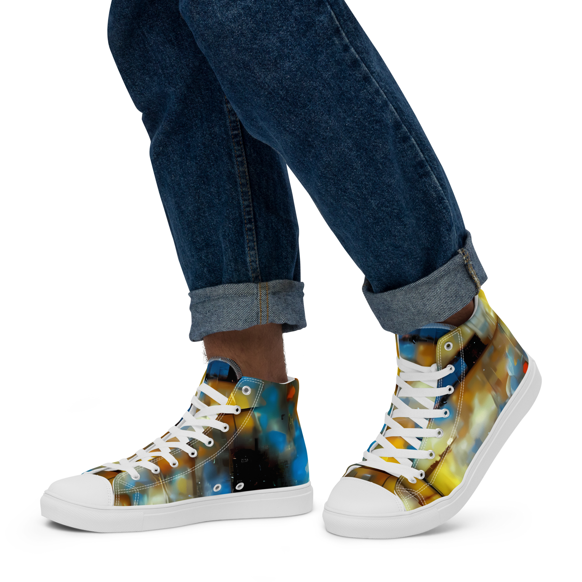 Stride into the avant-garde with our Men's High Top Canvas Shoes, cloaked in the exclusive "Kohn Cubism" pattern. These shoes are a wearable masterpiece, featuring a kaleidoscope of orange, blue, and yellow hues that collide in an abstract geometric dance. The blurred textures and stark black lines channel the spirit of Cubist art, making these high tops a statement piece for the artistically inclined. Perfect for making a bold impression at gallery openings or embodying creative flair in your everyday wanderings, especially in the vibrant seasons of spring and summer.