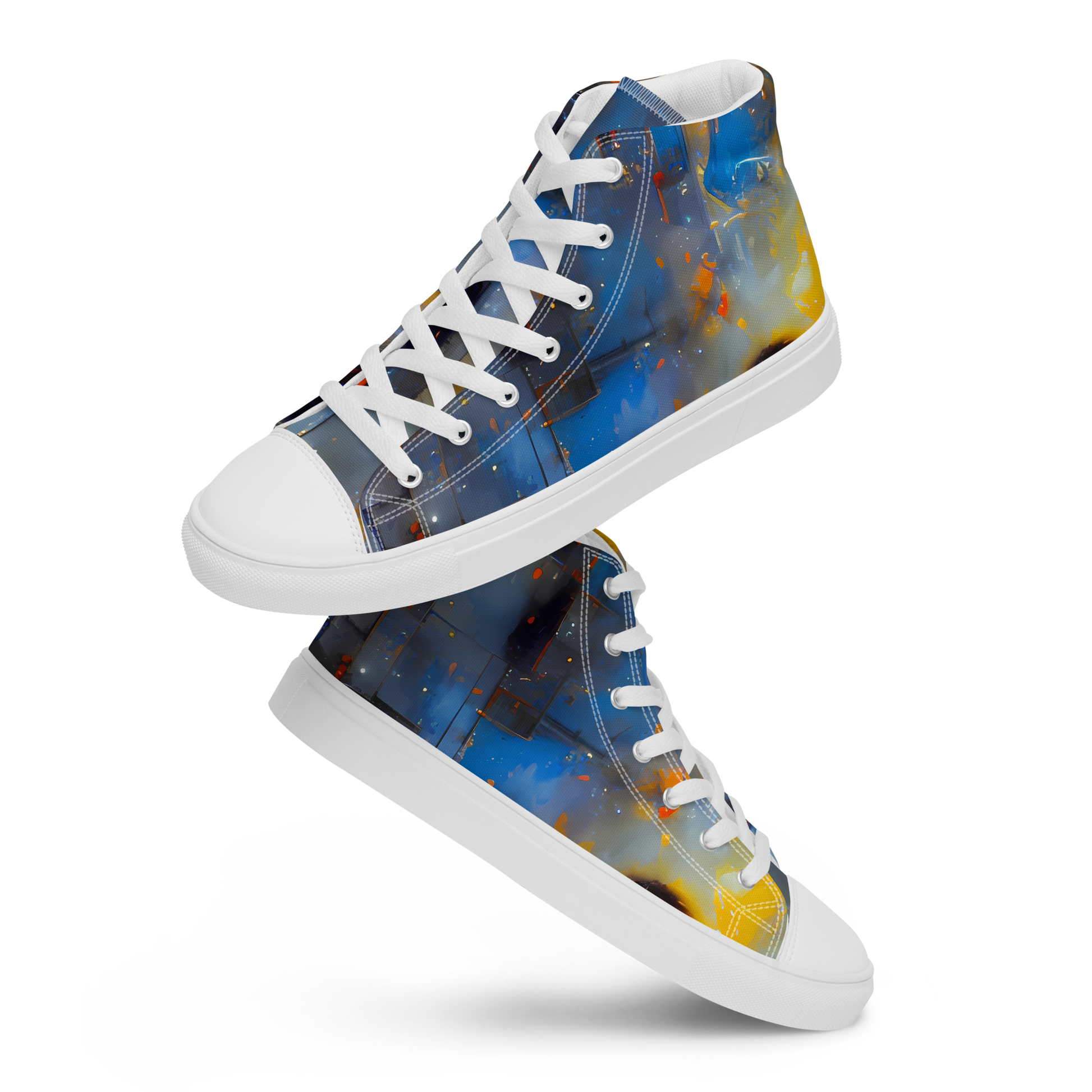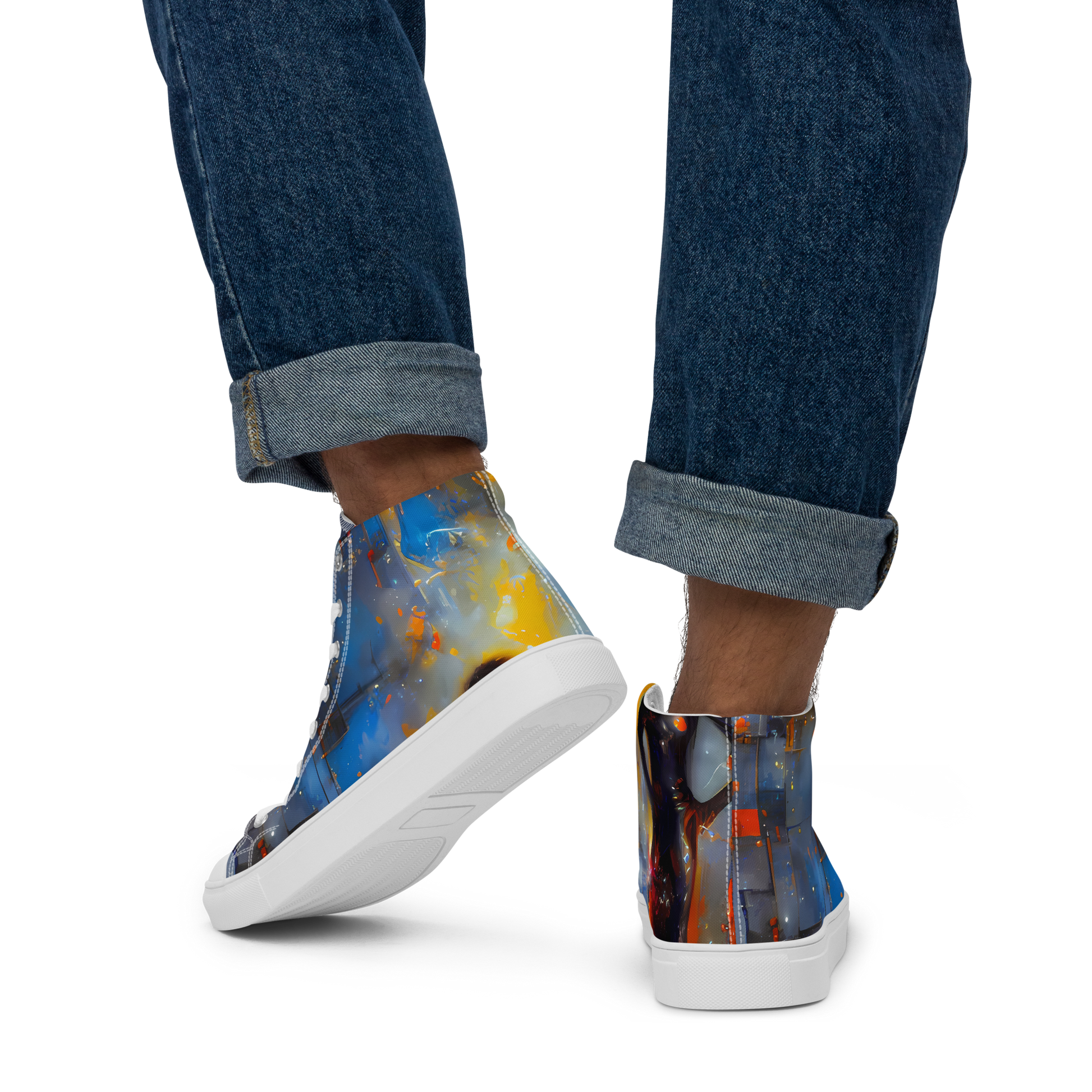 Introducing our Men's High Top Canvas Shoes, a sartorial masterpiece that captures the essence of cosmic adventure and artistic boldness. Wrapped in a vibrant pattern that dances with primary colors and celestial textures, these shoes are a testament to modern design, intersected by stark black lines that ground the exuberance in sophistication. The subtle gradients add a touch of elegance, making these high tops the perfect companion for those who dare to stand out at spring flings, artful rendezvous, or while strutting with confidence under the summer sun.