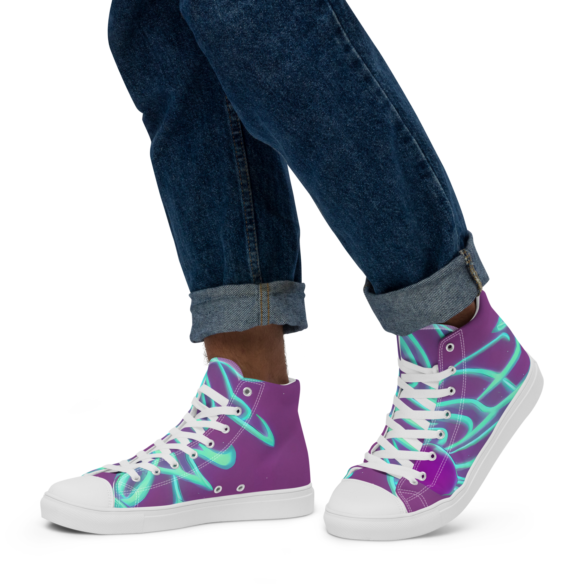 Immerse yourself in the electrifying essence of the digital frontier with our Men's High Top Canvas Shoes. Wrapped in a dynamic spectacle of electric blue swirls against a deep purple canvas, these shoes capture the essence of a futuristic odyssey. With orbs that seem to float in this cybernetic dreamscape, they are a perfect fit for the bold at heart, ready to make a statement at summer festivals or the forefront of avant-garde fashion scenes.