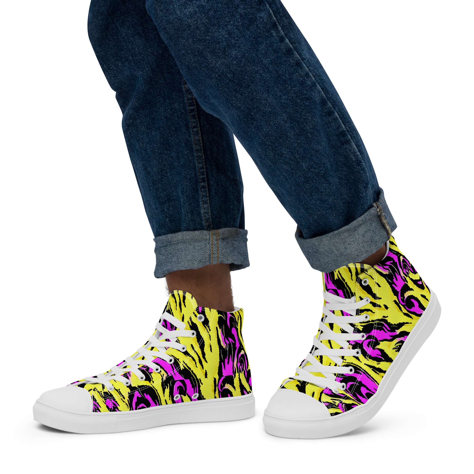 Unleash the vibrancy of the wilderness with our electrifying High Top Canvas Shoes, wrapped in a pattern that captures the essence of a neon-lit savanna. Bold stripes reminiscent of zebras under an otherworldly sky, where vivid yellows and striking pinks intermingle, bring your footwear to life with a texture that’s as visually stunning as it is a pleasure to touch. Ideal for those who live for summer festivals, thrive in the buzz of the nightlife, or simply wish to exhibit a sense of daring and exploration in their everyday wear.