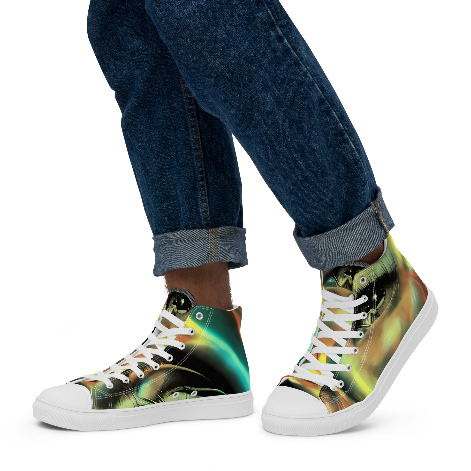 Immerse yourself in the enigmatic allure of our High Top Canvas Shoes, where artistry and footwear converge. Each pair is a canvas for an extraordinary pattern that interweaves the abstract dynamism of color waves with the arresting detail of facial contours. The rich teal, orange, and golden tones dance across the fabric, creating a sophisticated tapestry that captures the eye and ignites the imagination. These shoes are a statement for those who dare to stand out, perfect for making an impression at avant-garde events or simply when you wish to express your unique sense of style.