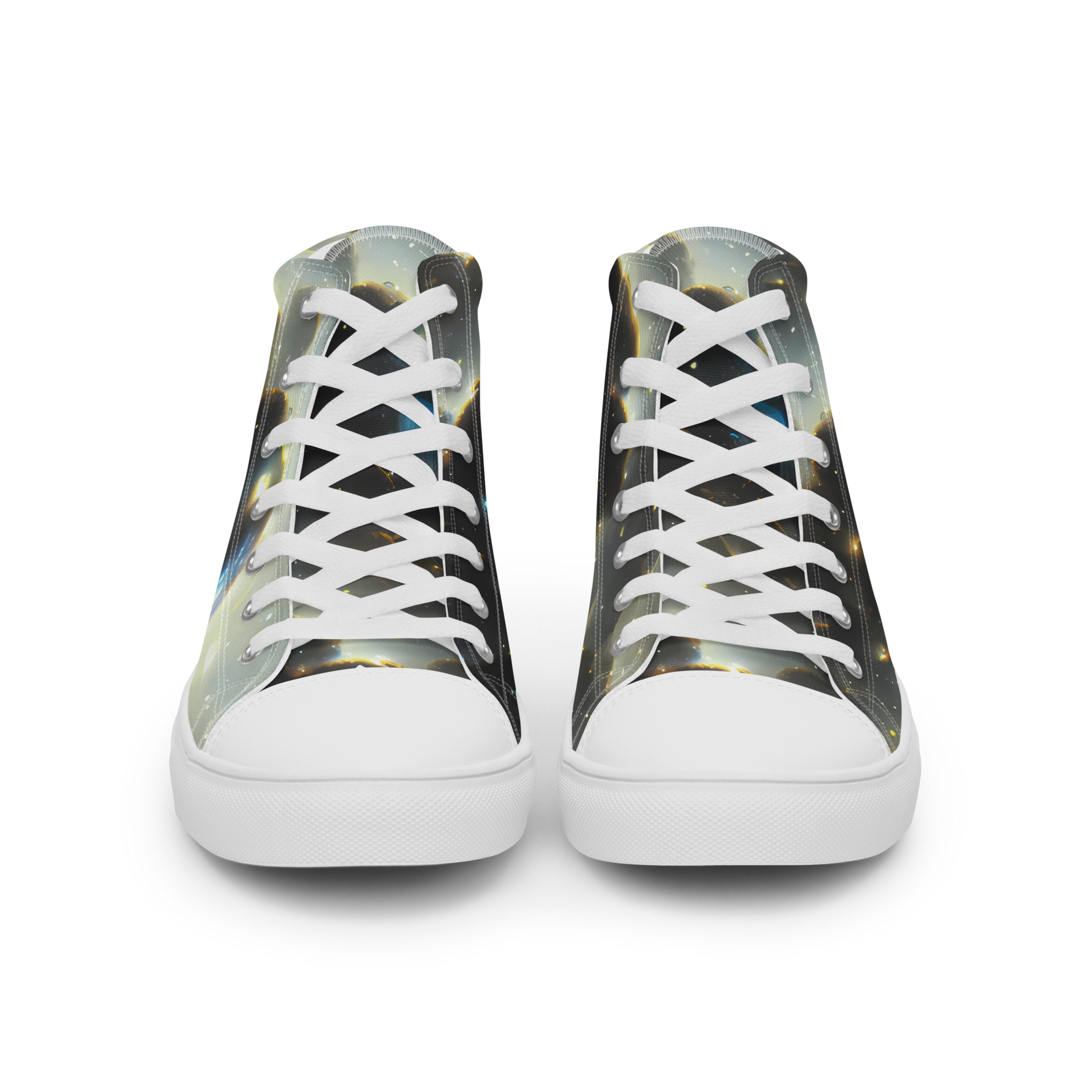 Step into the cosmos with our custom-designed High Top Canvas Shoes featuring the stunning "Rutkowski Nebula" pattern. This captivating design swirls with deep blues, golden yellows, and starry whites, embodying a sense of adventure and creativity. Perfect for the imaginative soul, these shoes combine artisan craftsmanship with a stylish flair, making them an essential addition to your fall and winter wardrobe.