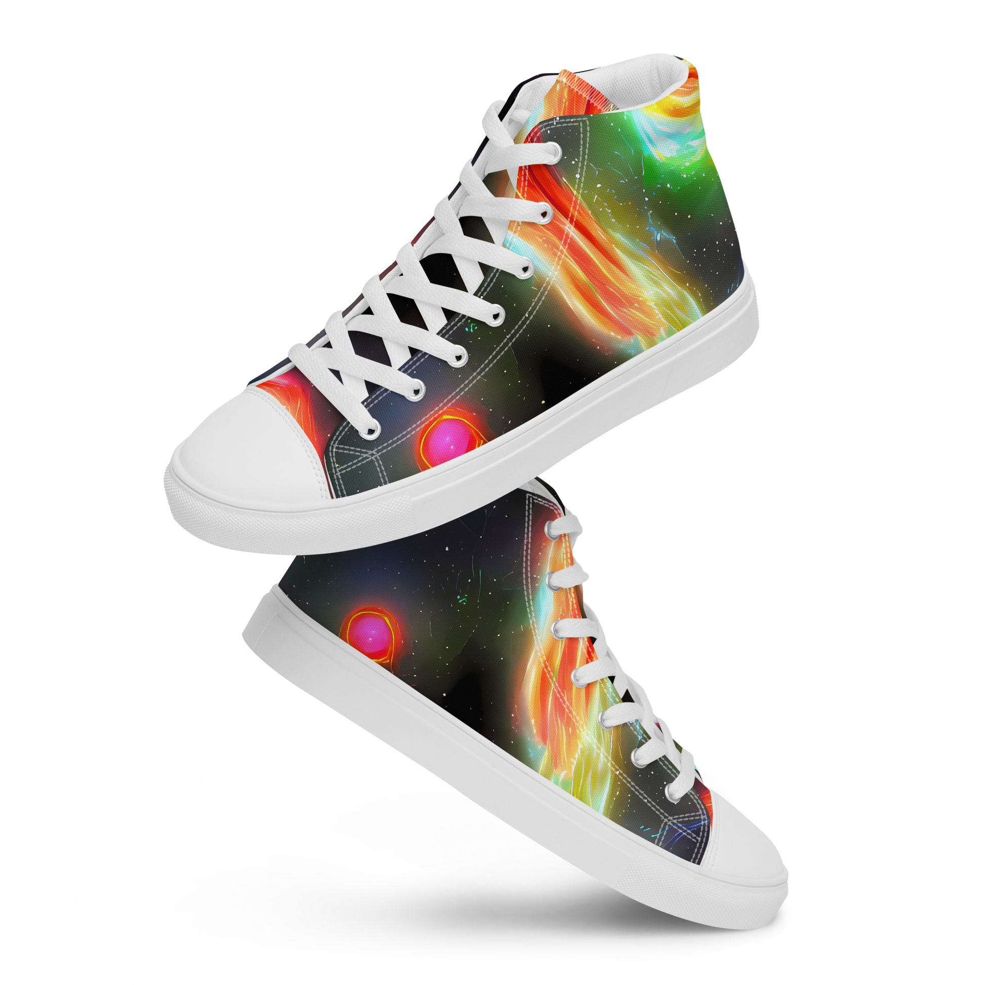 Step into the essence of cosmic adventure with our High Top Canvas Shoes, wrapped in the dynamic "Sherwood Swirl" pattern. This energetic design features a mesmerizing blend of reds, greens, yellows, and blues, swirling against a starry black canvas, perfect for those who dare to express themselves with every step. Whether you're headed to a creative gathering or making a statement in the urban jungle, these shoes are your ticket to a bold, adventurous look that knows no bounds.