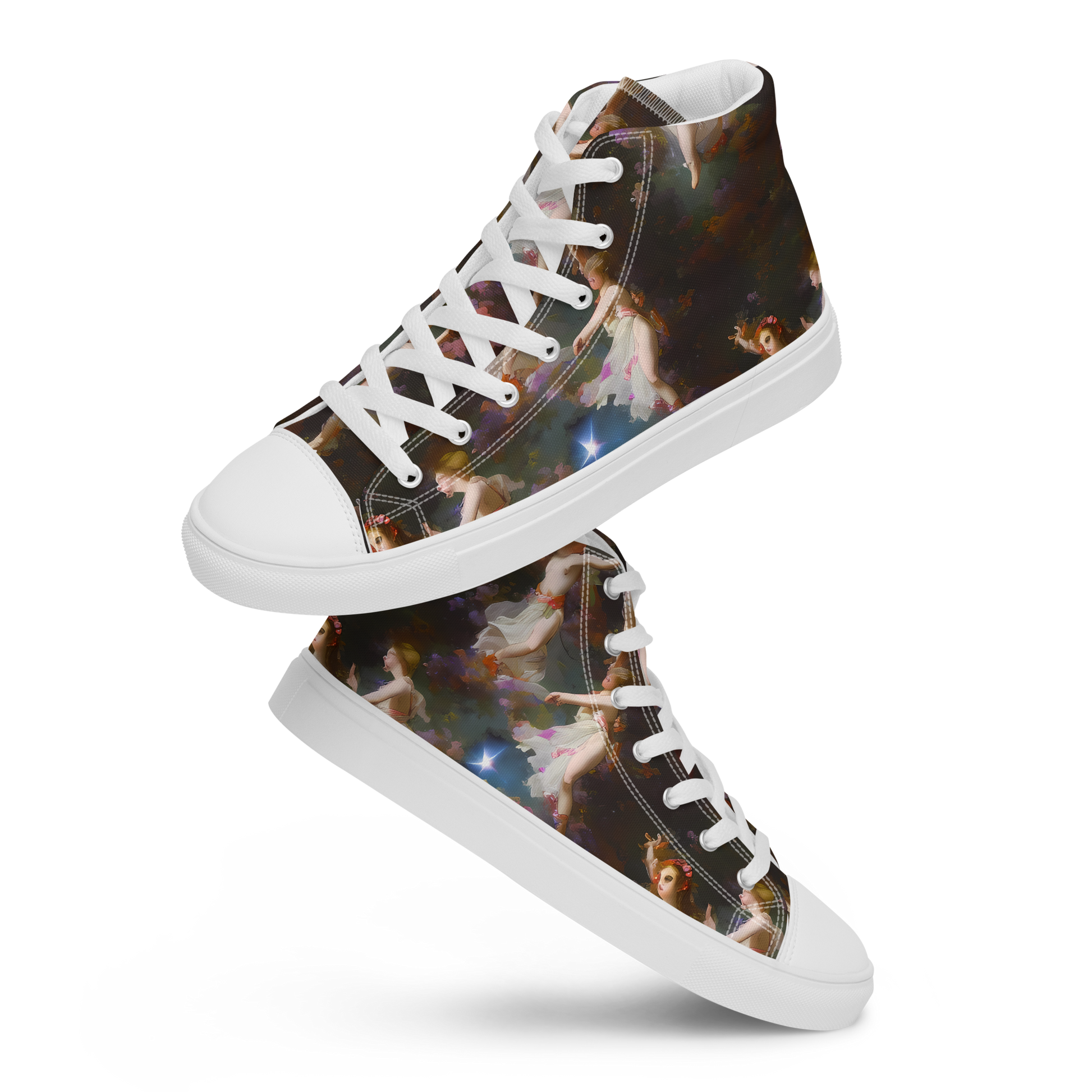 Step into a realm of elegance and fantasy with our Men's High Top Canvas Shoes, where timeless artistry and celestial allure collide. Each pair is a canvas for an enchanting design, where figures inspired by the grace of classic portraiture dance across a backdrop of deep space colors. Rich purples, warm golds, and soft pinks intertwine in a dreamlike pattern that evokes the sophisticated charm of a starlit gala. These shoes are a must-have for the trendsetter who dares to make a whimsical yet bold statement, merging the romance of historical art with the edge of modern fashion.