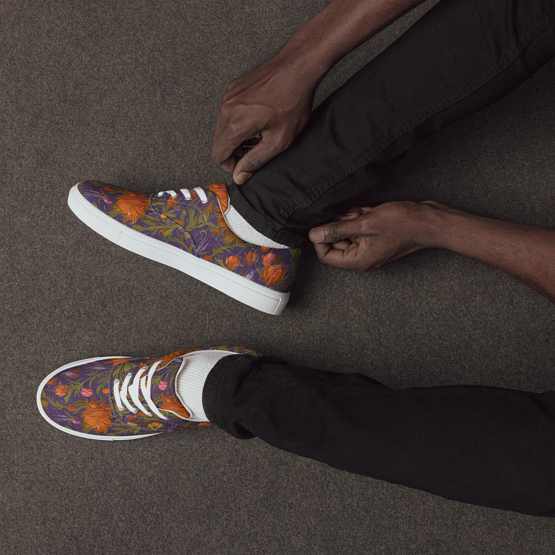 Embark on a sartorial journey through the cosmos with our men's lace-up canvas shoes, featuring the hypnotic allure of a floral tapestry set against the enigmatic beauty of the universe. Vibrant orange, pink, and yellow blooms burst forth among verdant greenery, contrasted by a deep purple void that captures the imagination. These shoes are not just footwear; they're wearable art that brings the grandeur of cosmic botany to your every step.