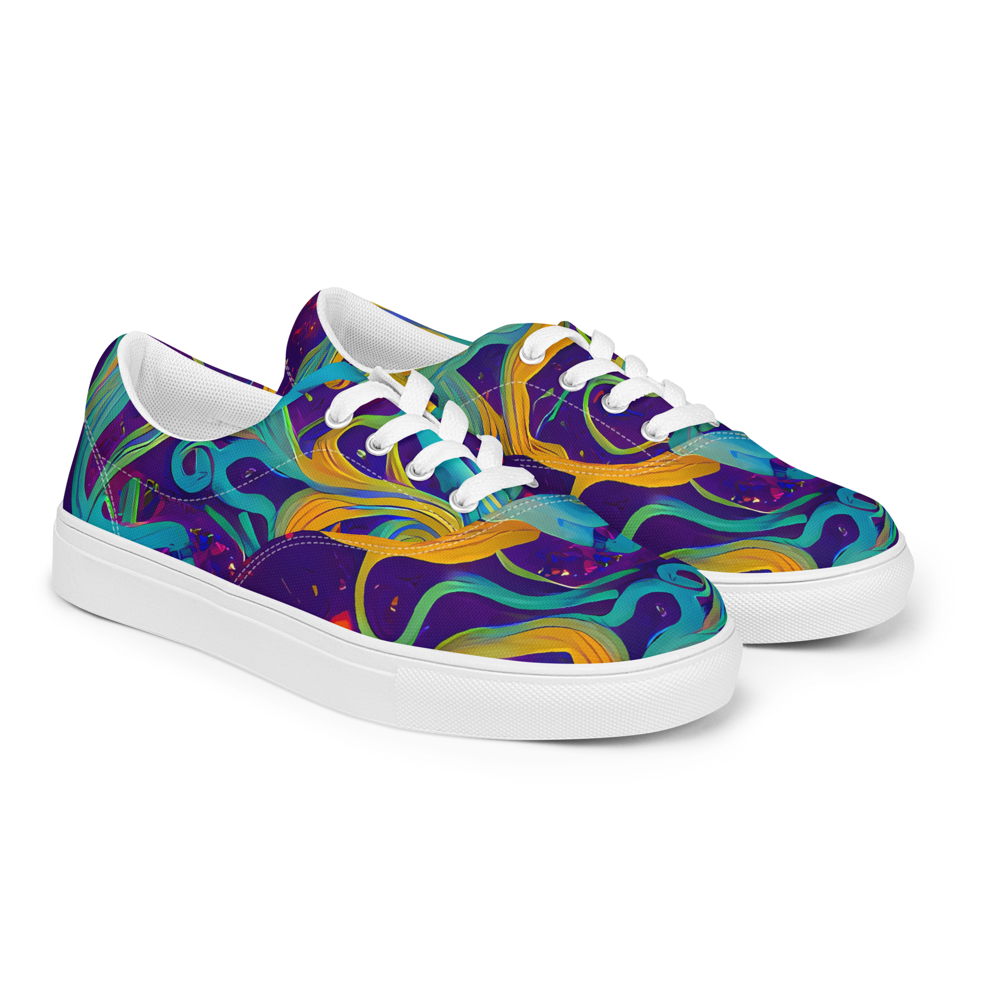 Unleash your creativity with our men's lace-up canvas shoes, featuring a captivating design that intertwines swirling teal and golden strands against a cosmic purple backdrop. This ethereal pattern, inspired by a blend of contemporary Indigenous artistry and Pre-Raphaelite elegance, brings a dreamlike, otherworldly vibe to your every step. Perfect for artistic gatherings or bohemian festivals, these shoes are a must-have for free-spirited, creative individuals looking to make a statement in spring and autumn.