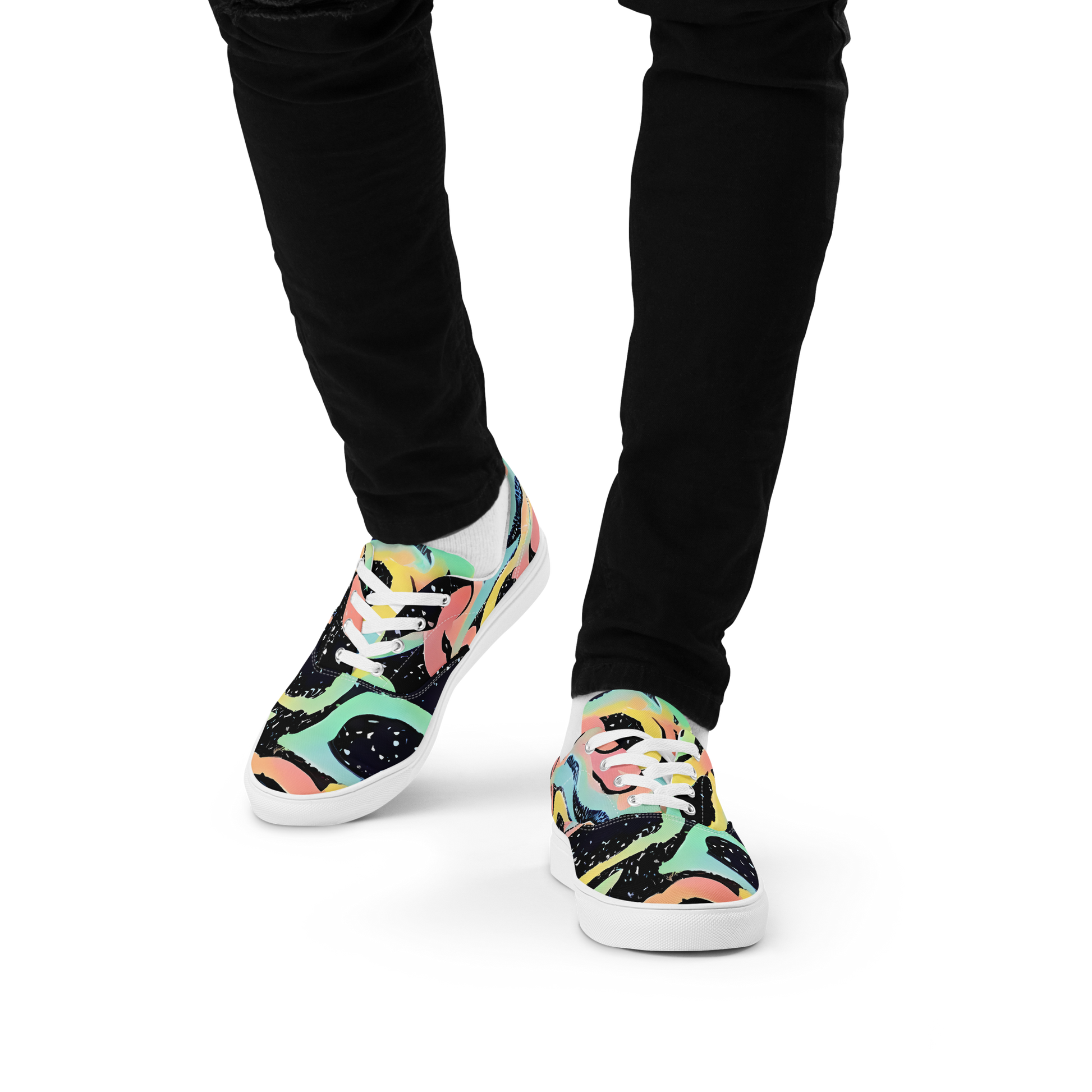 Immerse your stride in the cosmic dance of our exclusive men's lace-up canvas shoes, featuring a vibrant, abstract pattern that captures the essence of a starry night with playful, undulating shapes. The rich interplay of pink, yellow, and pale blue against the deep black canvas, peppered with white, crafts a footwear masterpiece that's as much a piece of art as it is a testament to your unique style. Perfect for those with an eye for the artistic and a penchant for the whimsical, these shoes are sure to turn heads and spark conversations at any casual or creative gathering.