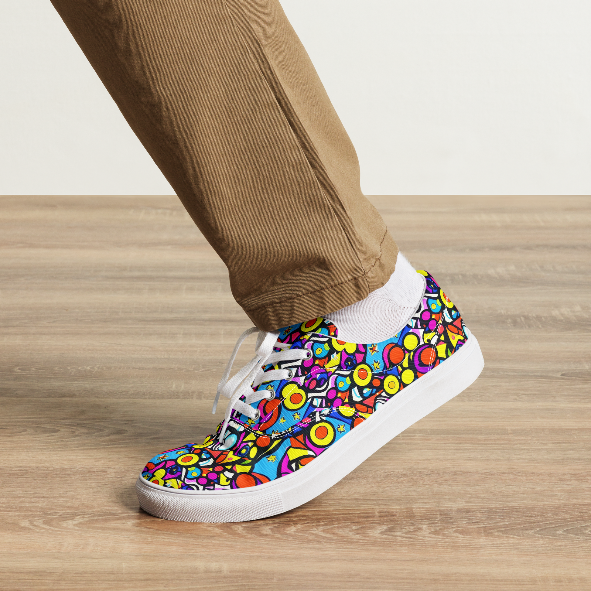 Embark on an interstellar adventure with our men's lace-up canvas shoes, wrapped in the cosmic vibrancy of a pattern that dances with electric blues, vivid yellows, and hot pinks. Every step is a journey through a space-themed spectacle, with celestial bodies and playful geometric shapes that capture the essence of a fantastical playroom in the cosmos. These shoes are the perfect accessory for the man who is ready to stand out at summer festivals or infuse his daily life with a splash of imaginative exuberance.