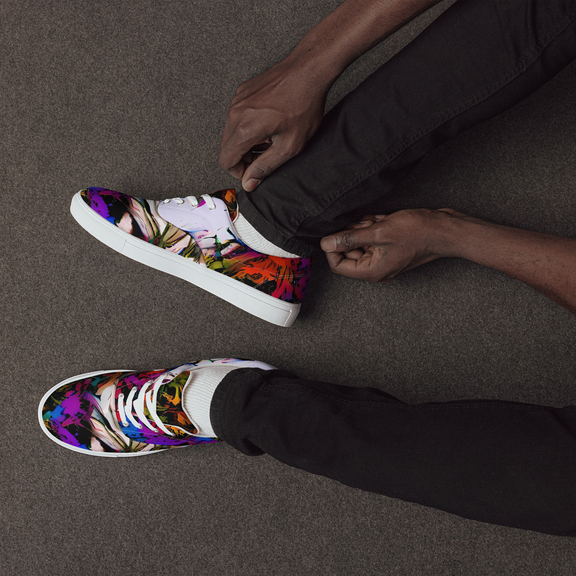 Immerse yourself in the allure of the night with our men's lace-up canvas shoes, featuring a mesmerizing pattern that captures the essence of a mysterious evening. Swirls of deep blues, fiery oranges, and mystical purples dance across the canvas, evoking the dynamic movement of smoke, while a pair of captivating eyes beckons from amidst the chaos, offering a glimpse into a world of enigmatic charm. Perfect for the confident man who commands attention, these shoes are a wearable piece of art that will turn heads at any art event or edgy social gathering.