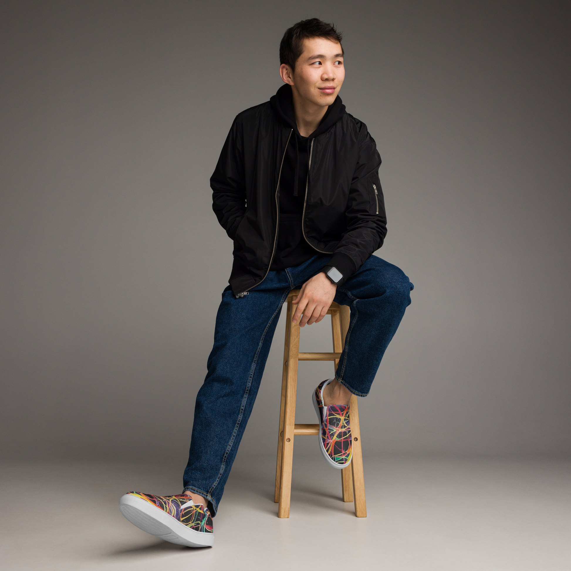 Ignite your wardrobe with a pair of Men's Slip-On Canvas Shoes that are as audacious and imaginative as you are. Wrapped in a mesmerizing design featuring a whirlwind of swirling lines and a kaleidoscope of fiery oranges, vivid yellows, and cool blues against a deep black canvas, these shoes are a wearable masterpiece. They're not just a fashion statement but a tribute to the fearless and artistic, ideal for standing out at any creative event or casual outing, no matter the season.