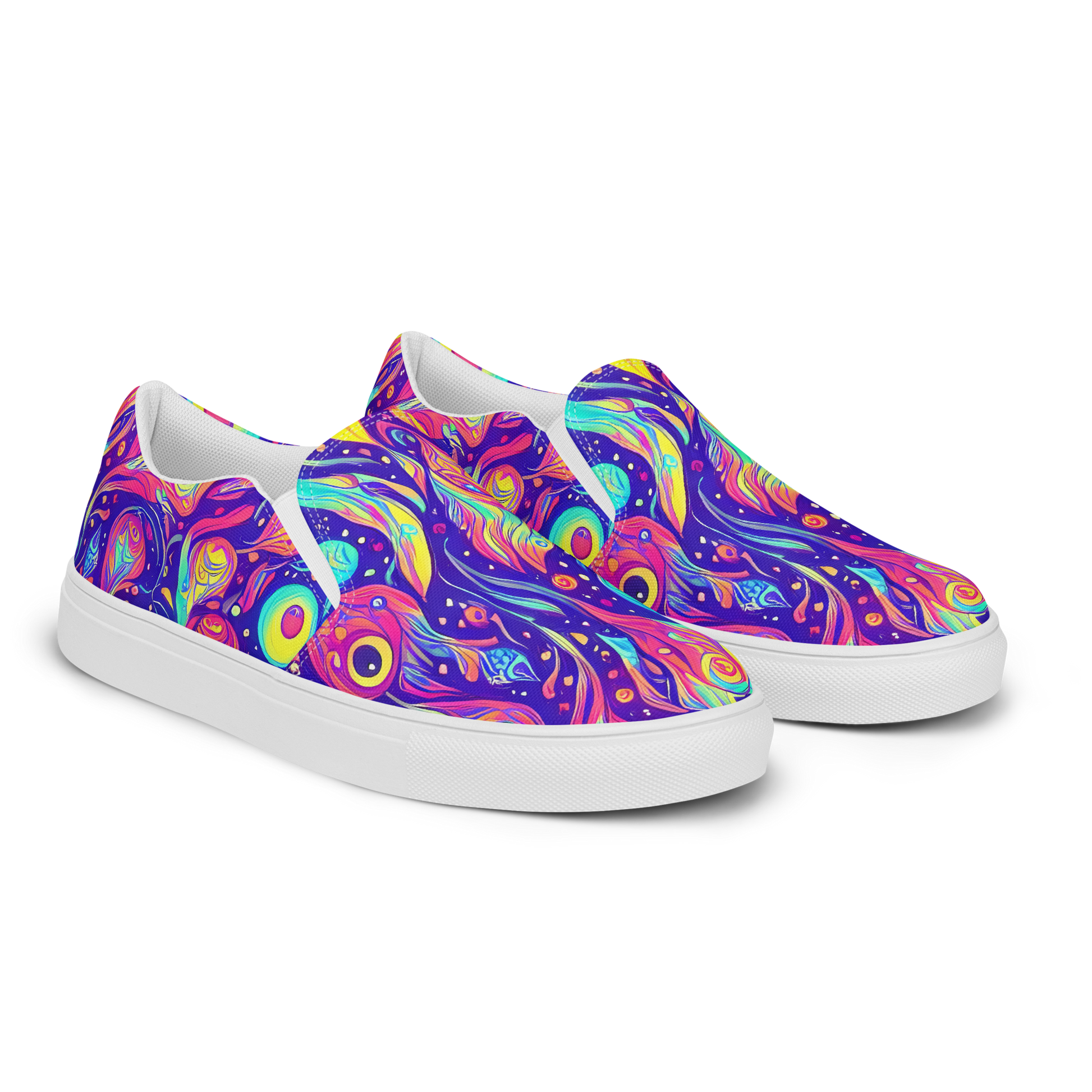 Unleash your adventurous spirit with our Men's Slip-On Canvas Shoes, featuring the mesmerizing "Mystic Petal Dance" pattern. These vibrant slip-ons showcase a tapestry of swirling neon blues, fiery oranges, and electric pinks, intertwined with cosmic motifs and abstract floral shapes. Perfect for festival-goers and avant-garde enthusiasts alike, these shoes offer a whimsical touch to your spring and summer wardrobe. Crafted with a 100% polyester canvas upper, they combine durability with standout style, while a breathable lining and soft insole ensure all-day comfort. Step into your unique style and let your playful personality shine with every step.
