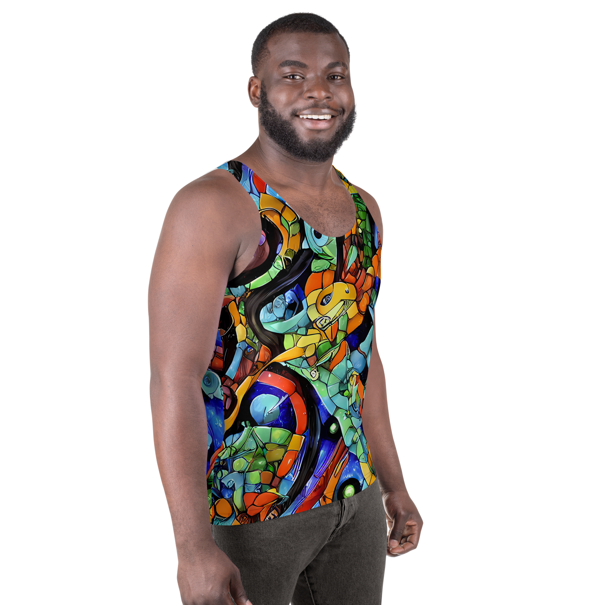 Dive into a sea of artistry with our Men's Tank Top, adorned with the vibrant "Cascade Muralista" pattern. This wearable piece of art boasts a rich palette of blues, oranges, and greens, creating a lively spectacle that captures the essence of famed murals. It's a statement piece that's perfect for cultural aficionados and those who dare to wear their creativity on their sleeve—or in this case, their tank top. Whether you're strolling through an art gallery or enjoying a summer festival, this tank top will keep you at the center of attention.