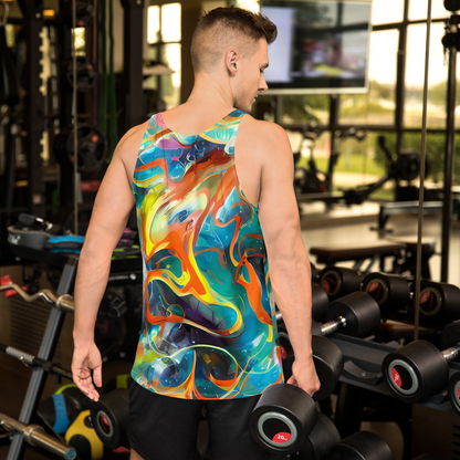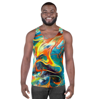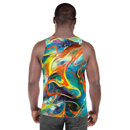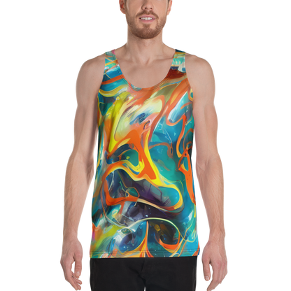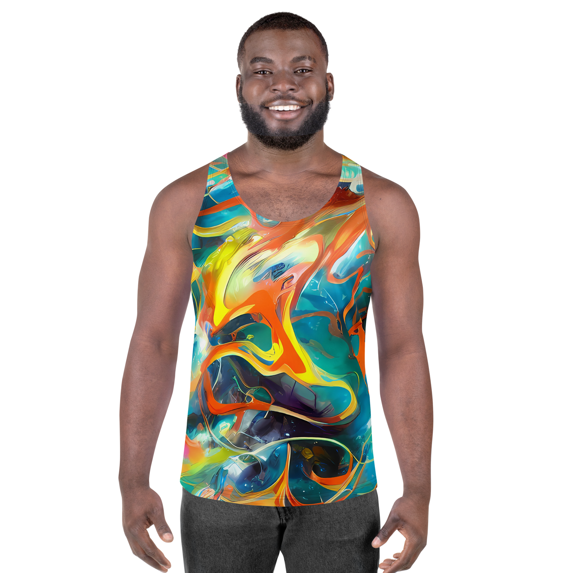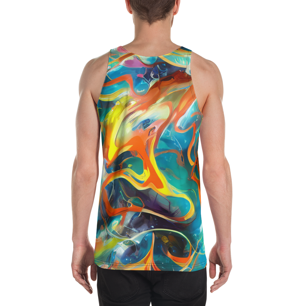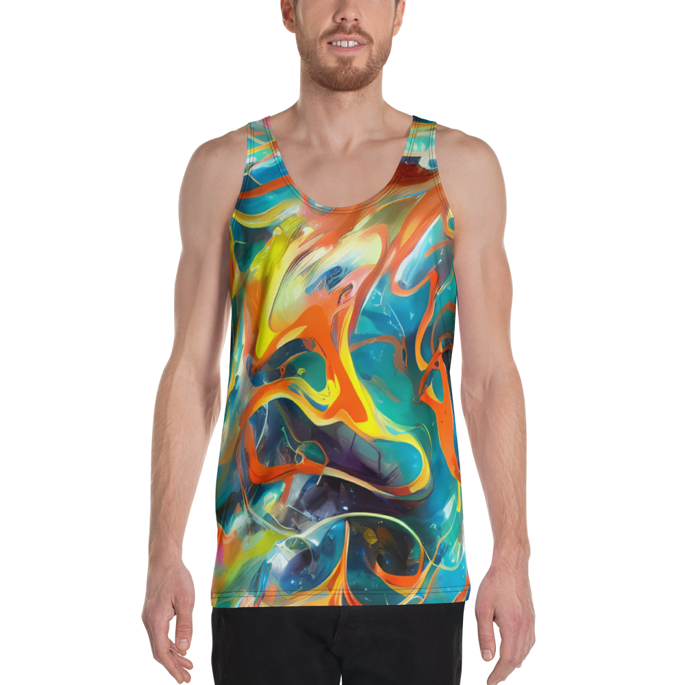 Unleash your inner artist with our Men's Tank Top adorned in the mesmerizing "Cecily’s Swirl" pattern. Immerse yourself in a canvas of bold orange, teal, and yellow swirls that capture the essence of Cecily Brown's expressive art. This tank top is a celebration of vibrant colors and creative spirit, perfect for those who dare to stand out at any artistic event or casual summer soiree. It's more than just clothing; it's wearable art that speaks to the soul.