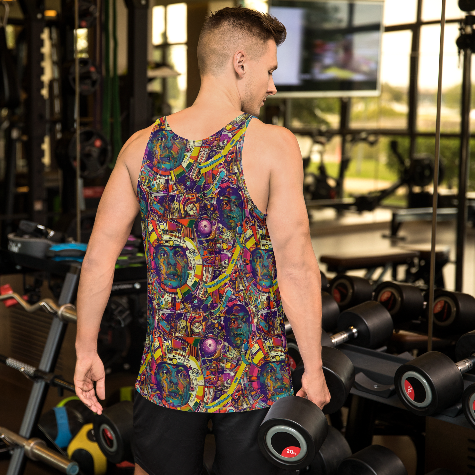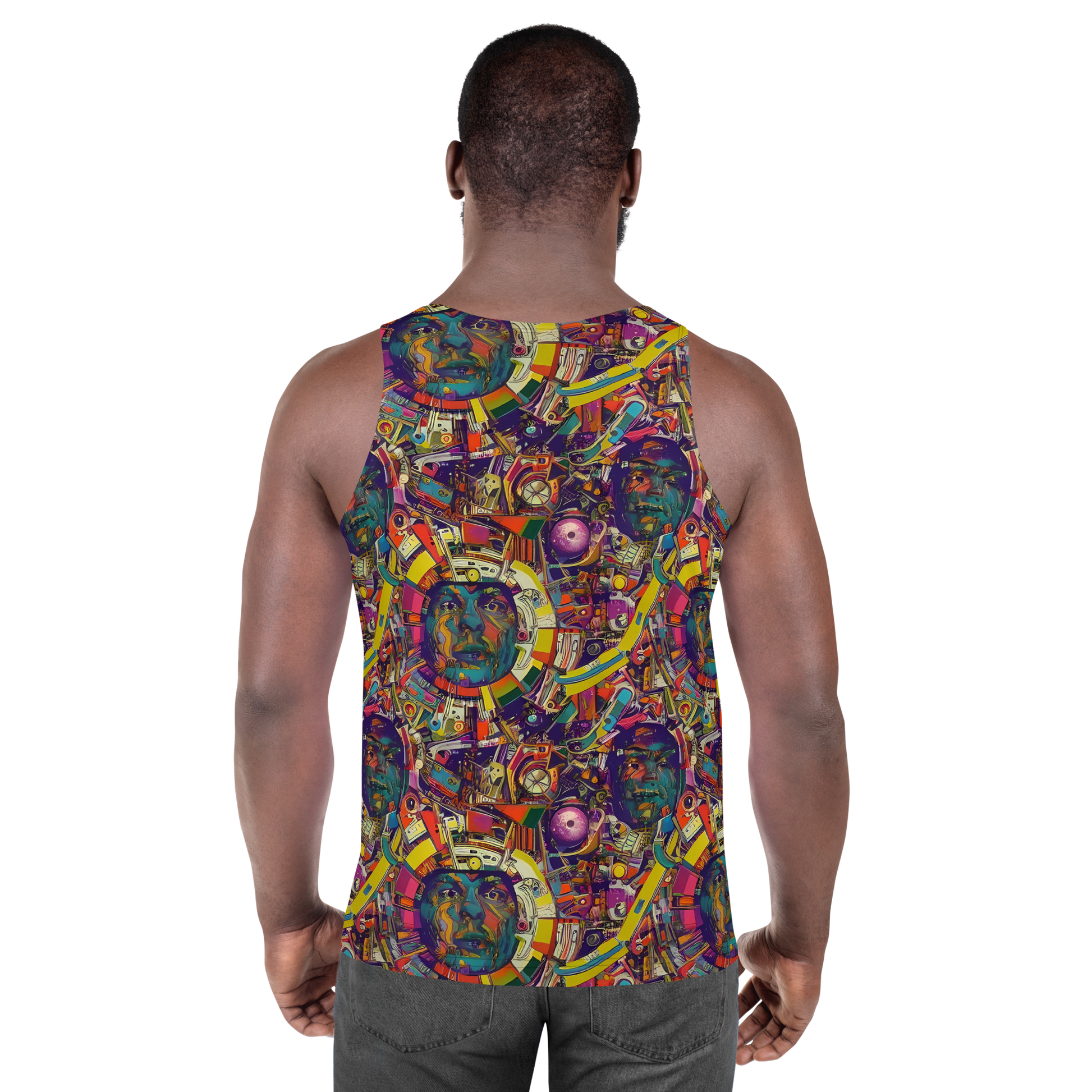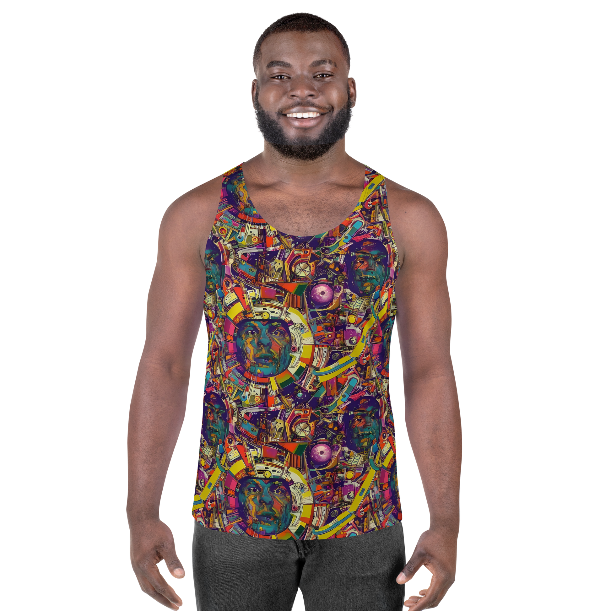 Elevate your wardrobe with our AI-designed tank top, featuring a vibrant, eclectic pattern bursting with a kaleidoscope of colors. This dynamic mix of abstract shapes, geometric forms, and surreal textures evokes a sense of cosmic wonder and psychedelic energy, perfect for festivals, art exhibitions, or any creative gathering. Embrace bold style and unbeatable comfort with a look that's as unique as you are!