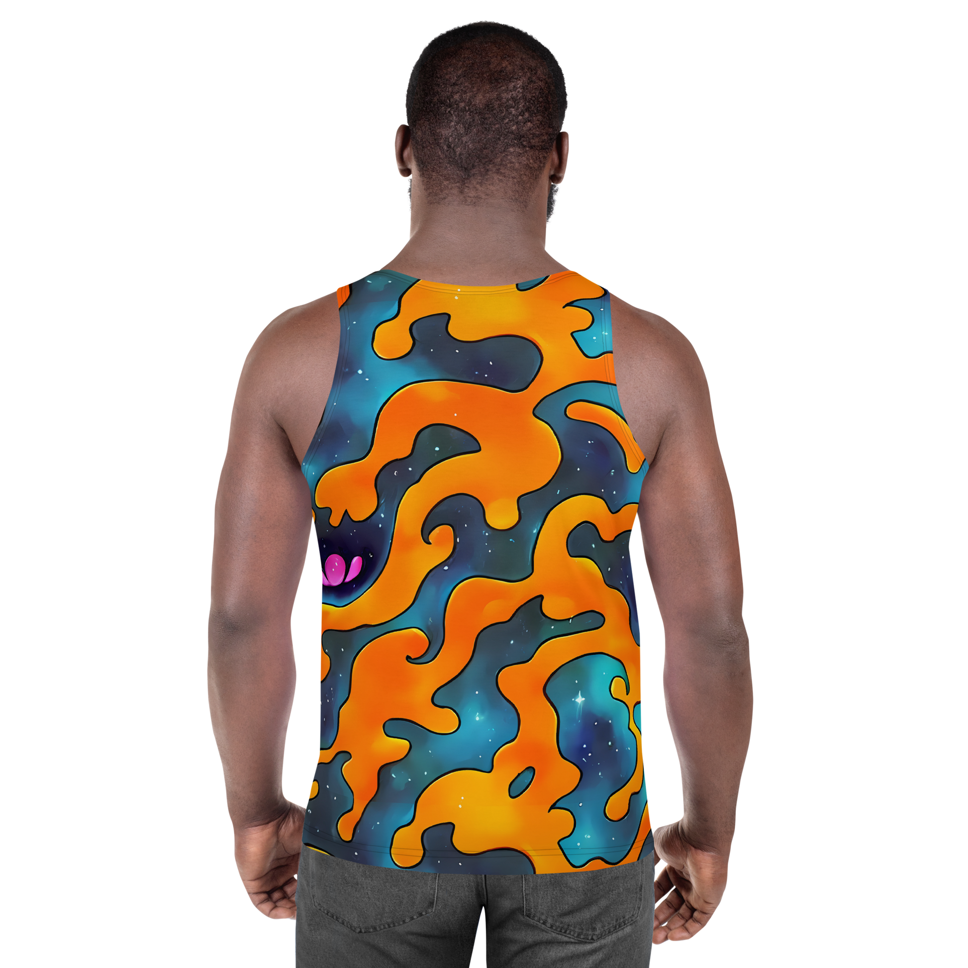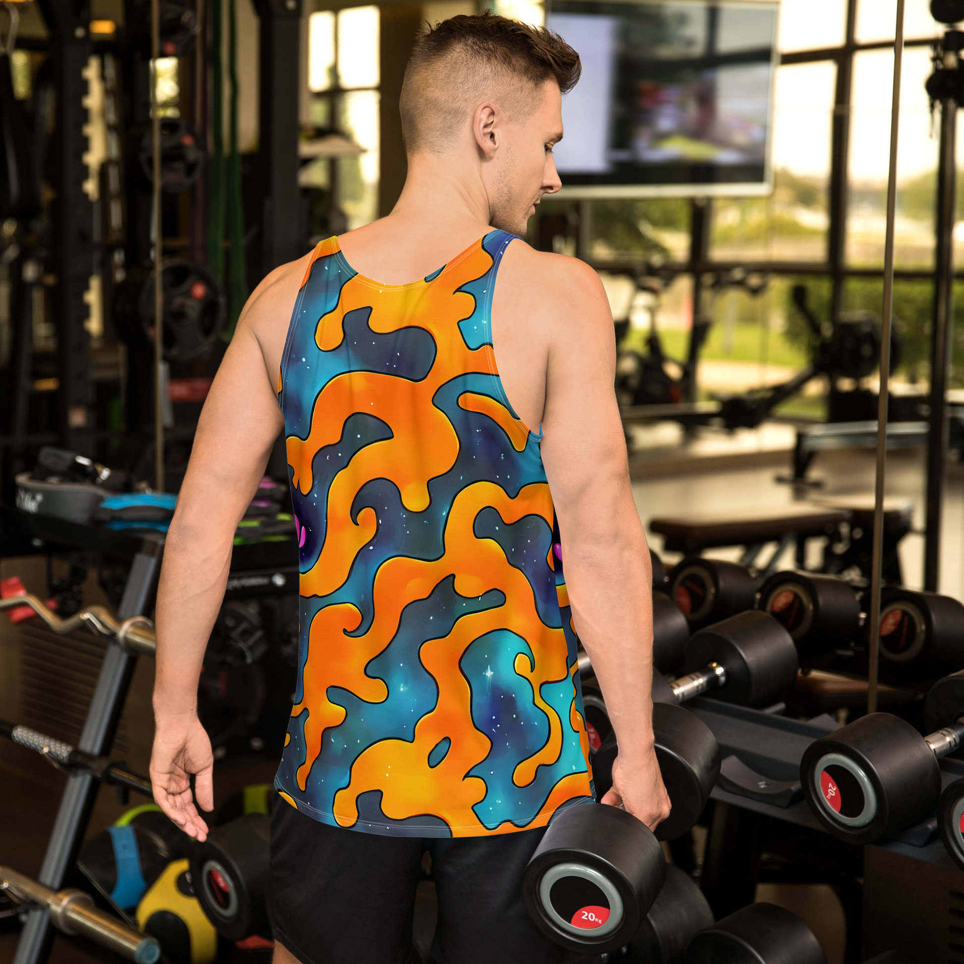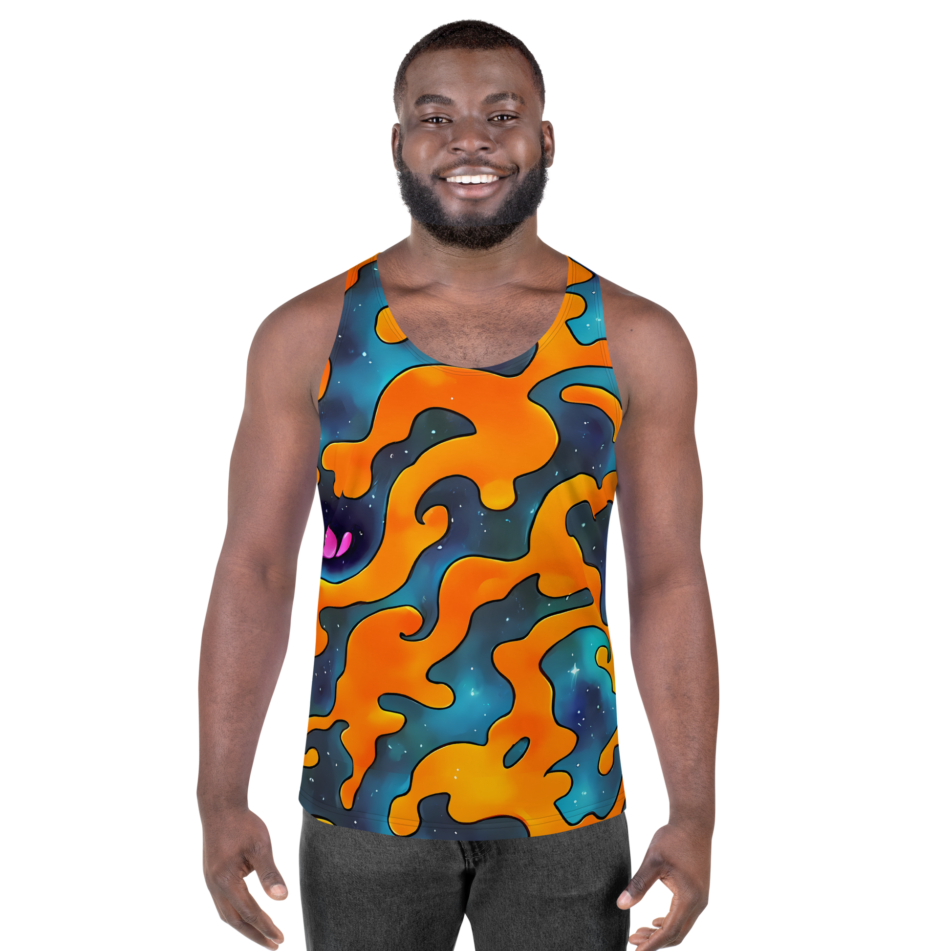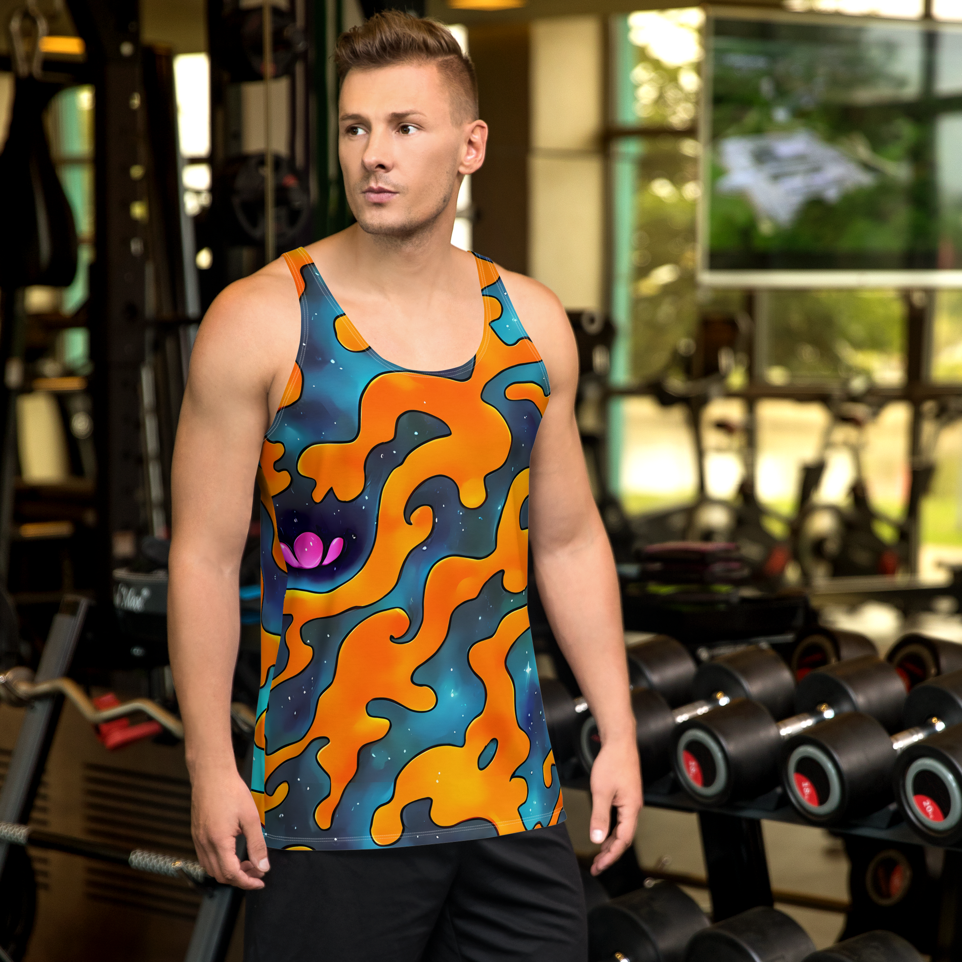 Step into a universe of style with our tank top, featuring a mesmerizing design that captures the essence of the cosmos. The dynamic orange shapes float on a deep blue, star-speckled sky, creating a bold contrast that's sure to turn heads. This tank top is not only a fashion statement but a celebration of the universe's boundless beauty, perfect for those who carry the spirit of exploration and creativity in their hearts.