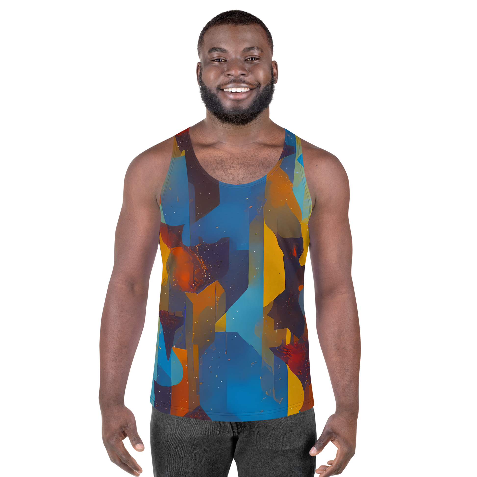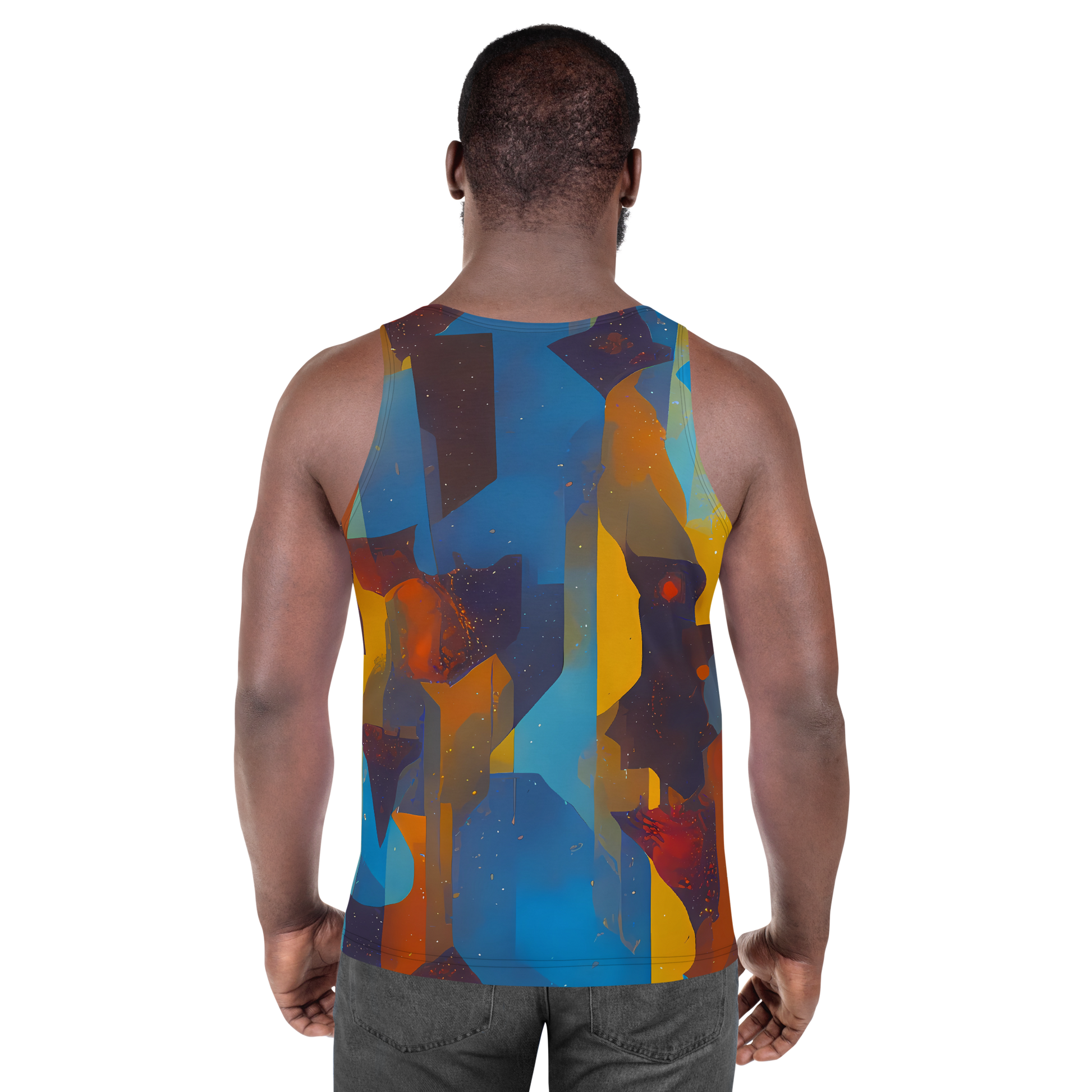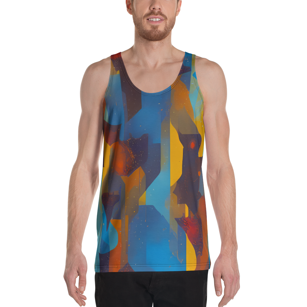 Immerse yourself in the artistry of the "Cubist Dusk" Men's Tank Top, where fashion meets the masterpiece of the setting sun. Our tank top is a wearable canvas, featuring an abstract mosaic of geometric shapes in rich oranges, deep blues, and warm yellows that capture the essence of a vibrant sunset through a Cubist perspective. The dynamic interplay of colors and shapes on this tank top not only commands attention but also complements your creative spirit, making it perfect for both artistic events and casual outings.
