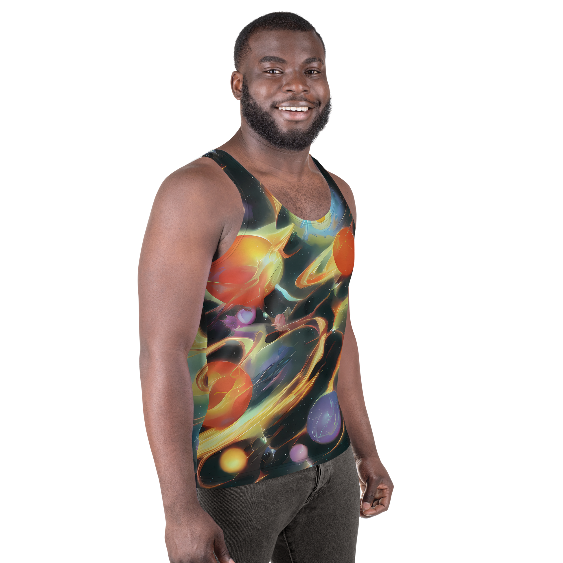 Step into a realm where art and attire fuse, with our Men's Tank Top adorned in the mesmerizing "Fabritius Fantasy" pattern. This garment is a tribute to the baroque splendor, capturing the cosmic dance of golden swirls and celestial spheres against a night sky canvas. It's the perfect statement piece for those who appreciate a touch of historical grandeur in their modern wardrobe, making it an ideal choice for evening soirees and autumnal celebrations. Wrap yourself in a universe of motion and color, and let your imagination soar with every wear.
