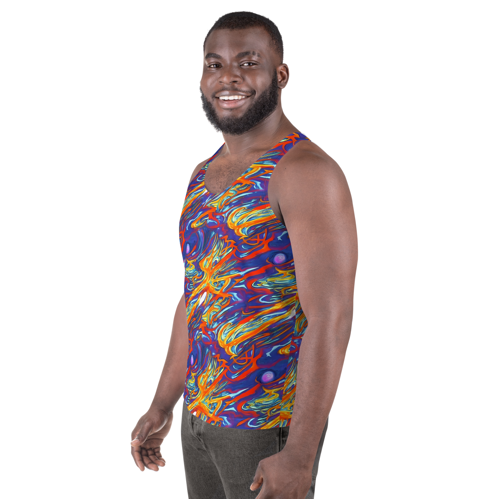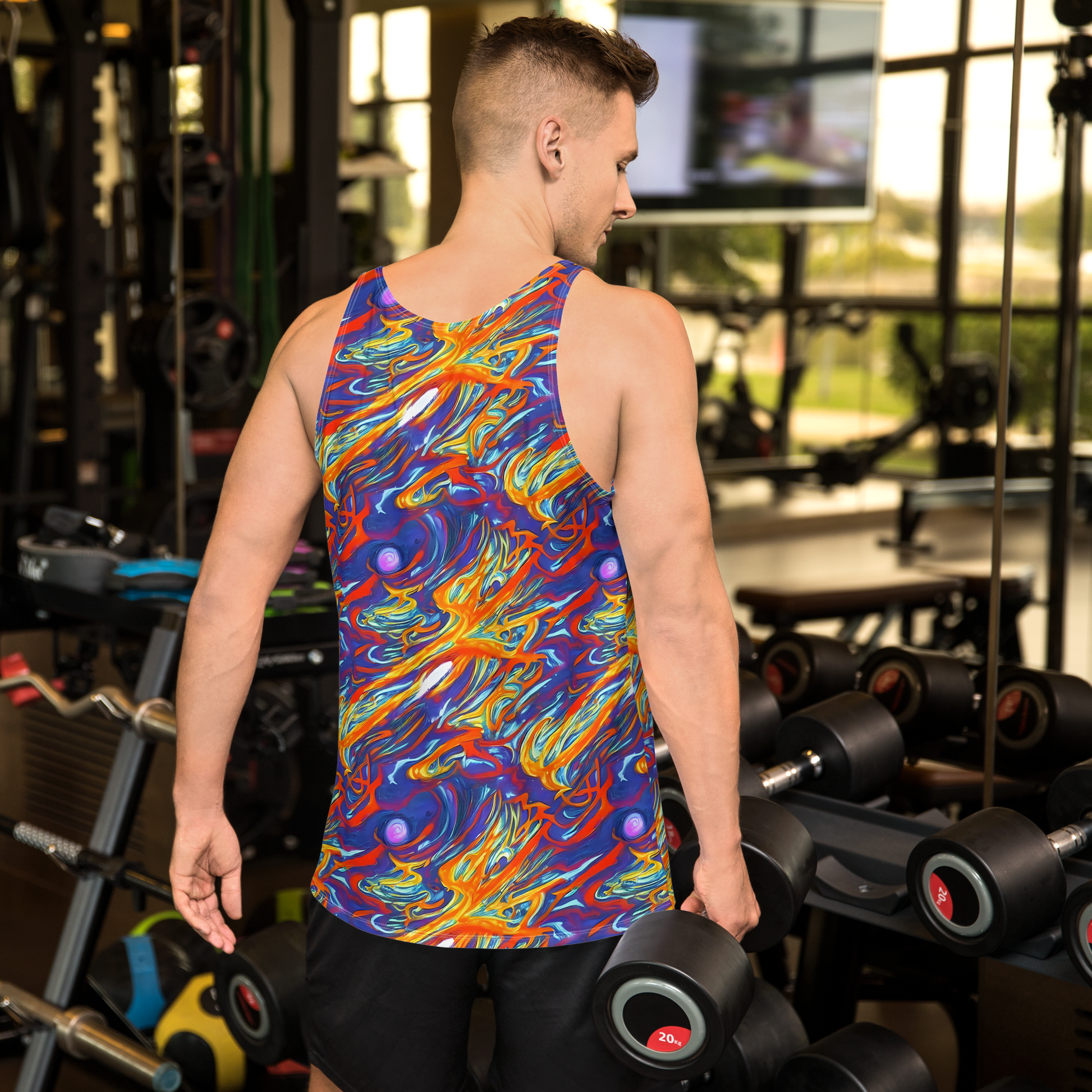 Unleash your inner artist with our Men's Tank Top, featuring a mesmerizing pattern of fiery oranges, electric blues, and deep purples that evoke the dynamic energy of cosmic phenomena. This vibrant, painterly design is perfect for those who dare to stand out, making it an ideal choice for summer festivals, art gallery openings, or any event where you want to leave a lasting impression. Experience unparalleled comfort and style with a tank top that's as unique as you are.