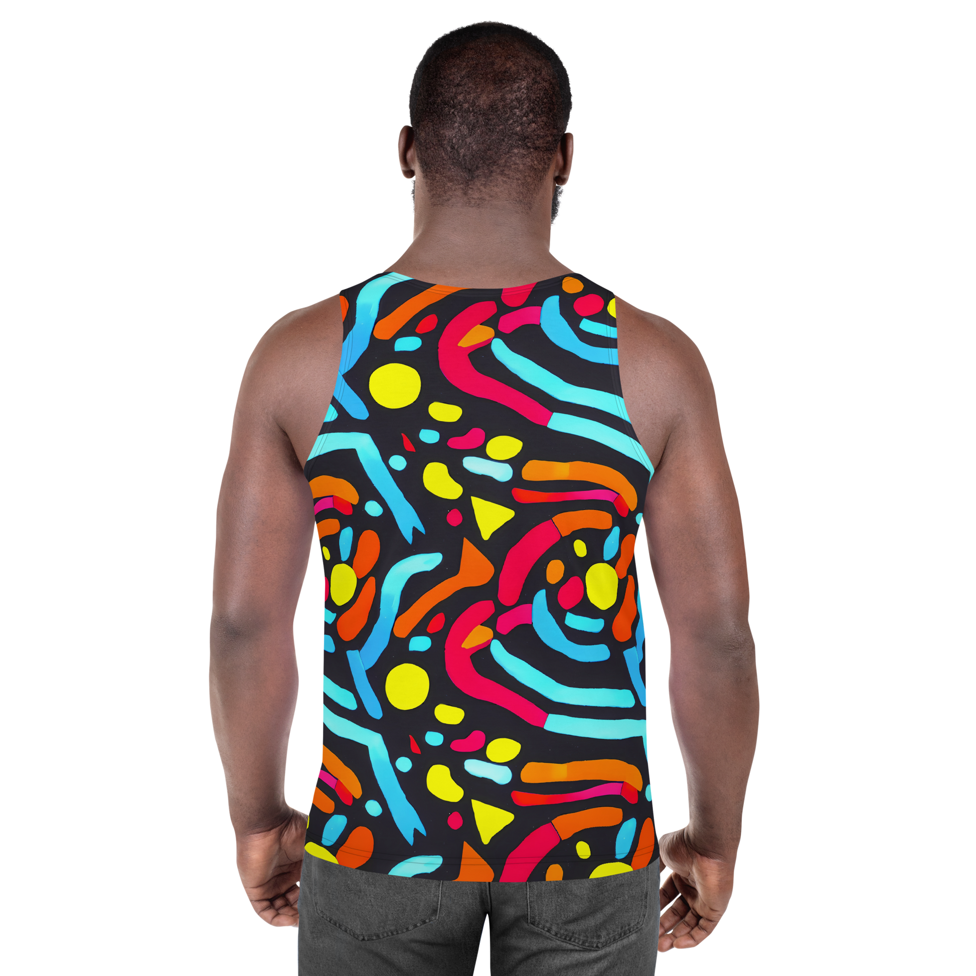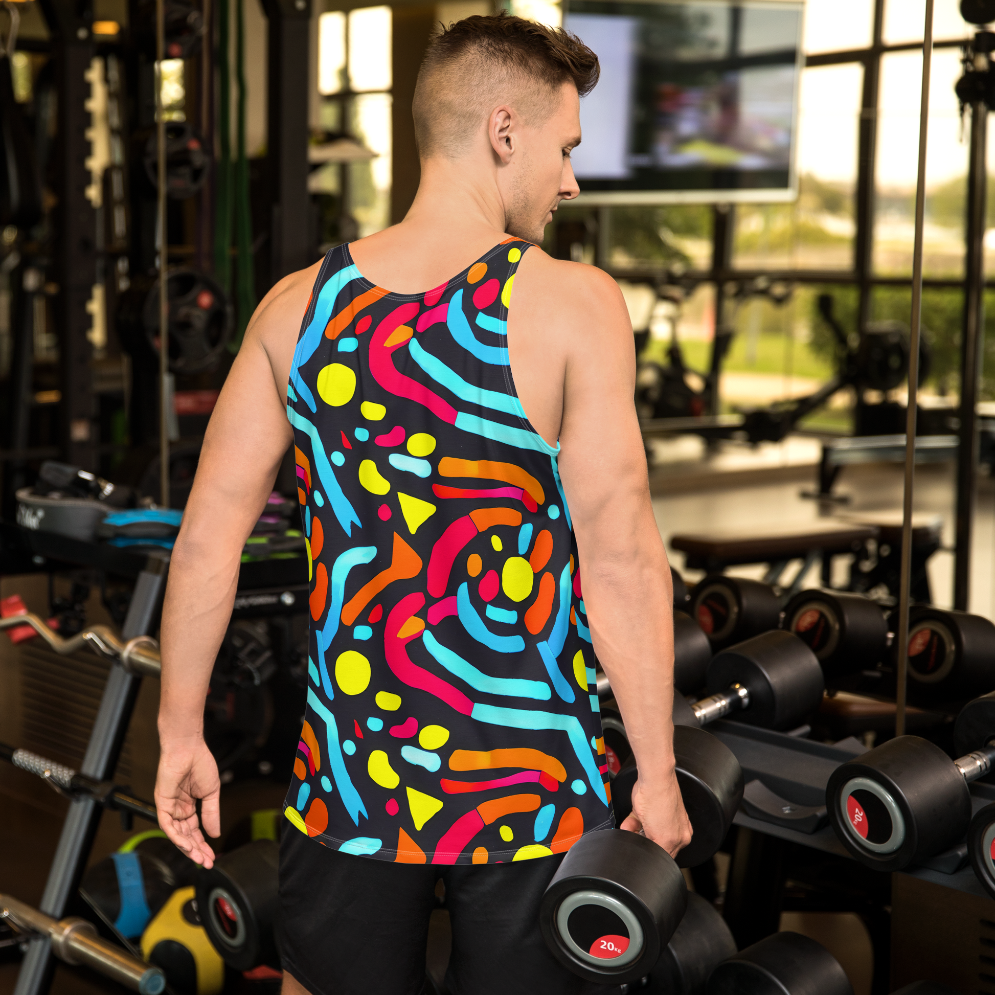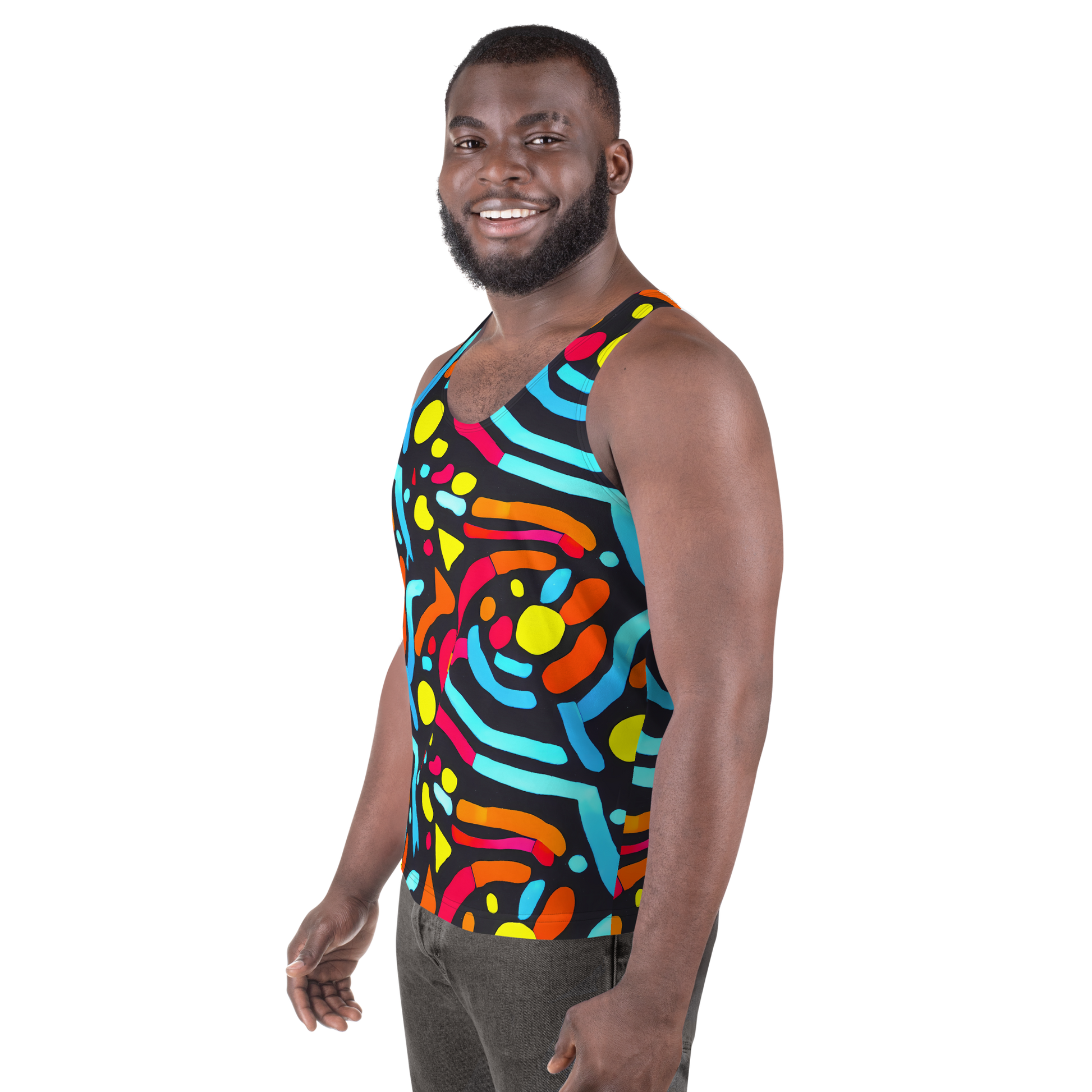 Unleash the essence of the night with our electrifying Men's Tank Top, featuring a pattern that captures the vivacious pulse of nocturnal adventures. The deep black backdrop sets the stage for a symphony of neon colors, with electric blue, fiery orange, and bright yellow streaks that command attention and celebrate your individuality. Perfect for those who dare to stand out, this tank top is your companion for evening socials and the vibrant festival scene.