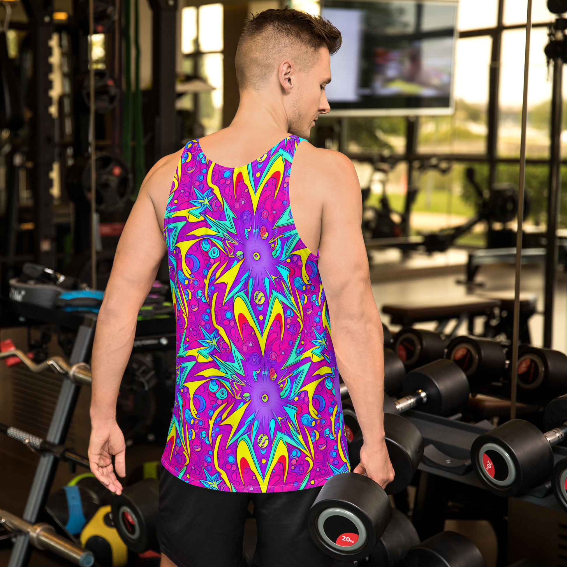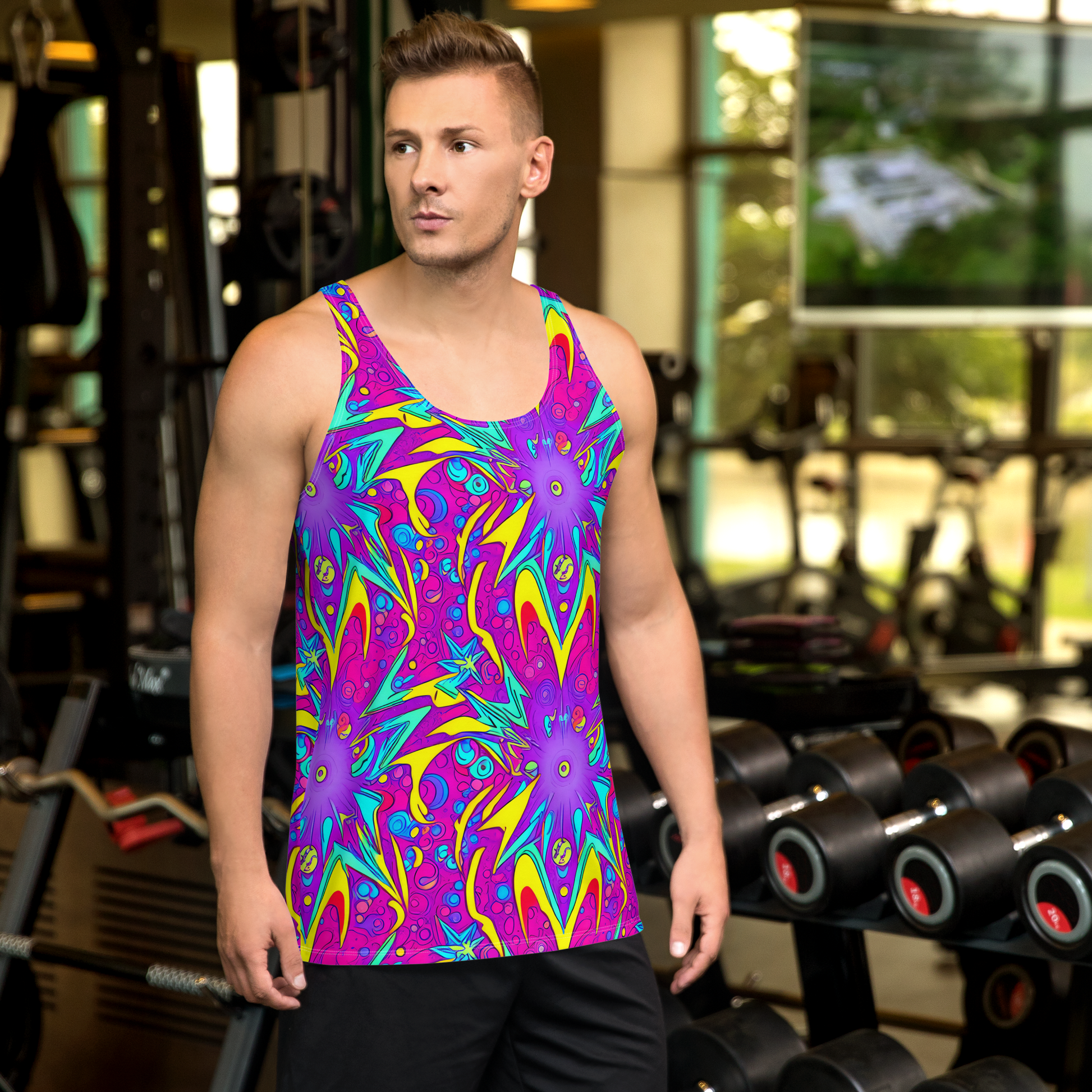 Step into a realm of cosmic creativity with our AI-designed tank top, featuring a pattern that bursts with vibrant hues of electric blue, neon yellow, and radiant magenta. Inspired by the mesmerizing expanses of deep space, this tank top showcases abstract, swirling shapes and cosmic motifs that evoke a sense of energy and wonder. Perfect for music festivals, summer gatherings, or any event celebrating creativity and individuality, this tank top is crafted for those with a vibrant, adventurous spirit.