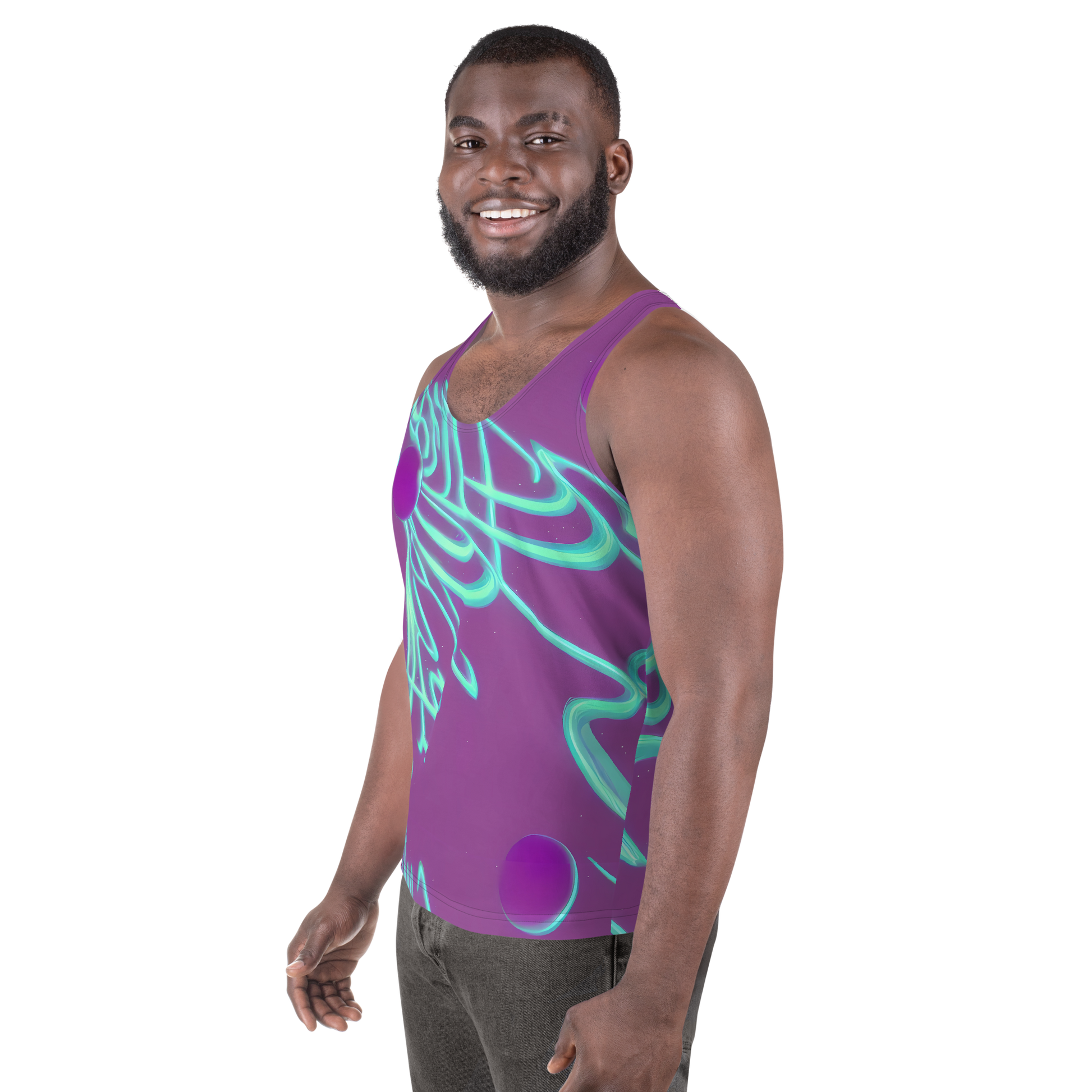 Dive into the electric dreamscape of our Men's Tank Top, where dynamic electric blue lines swirl across a deep purple canvas, creating a spectacle of movement and energy. This tank is a nod to the fusion of digital art and cyberpunk flair, designed for the bold at heart. Its orbs of light add a layer of mystique, making it your go-to piece for summer festivals or avant-garde fashion moments. Make a statement that's both artistic and stylish with a tank top that's as unique as your creative spirit.